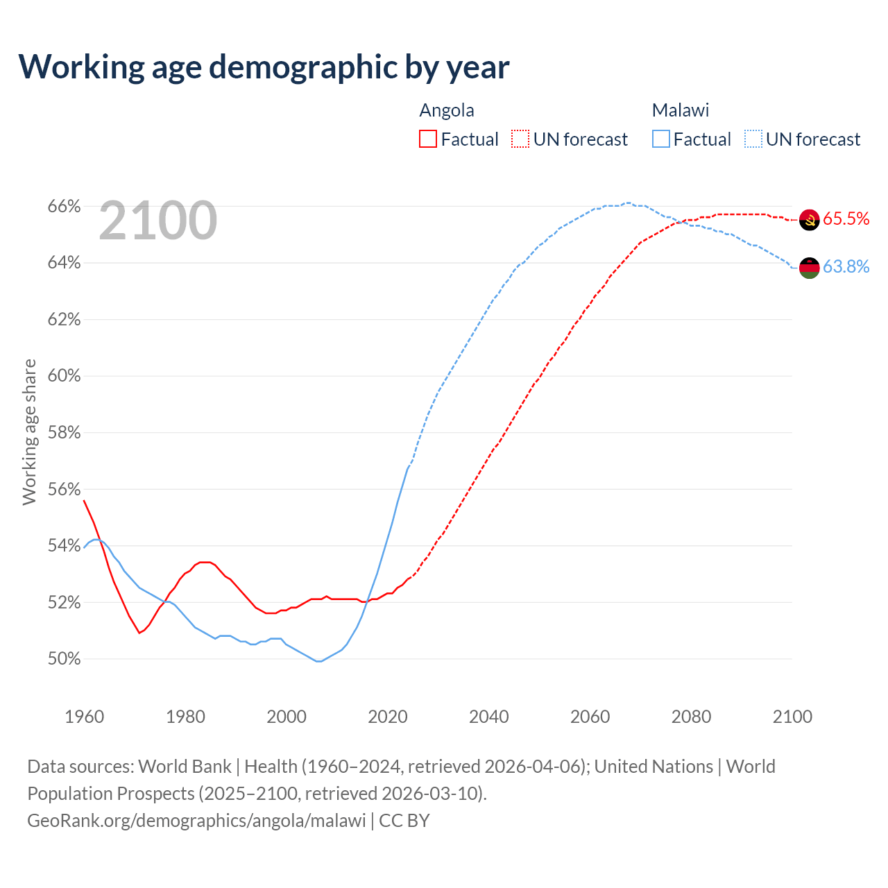 - The share of old-age demographic (65+) in Angola is 2.85% vs 2.59% in Malawi.