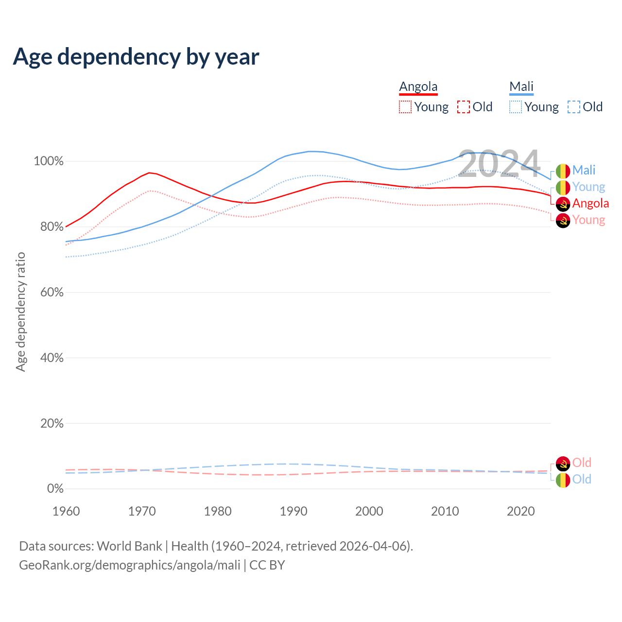 - Angola is ranked 188/196 by median age (oldest to youngest) vs 193/196 for Mali.