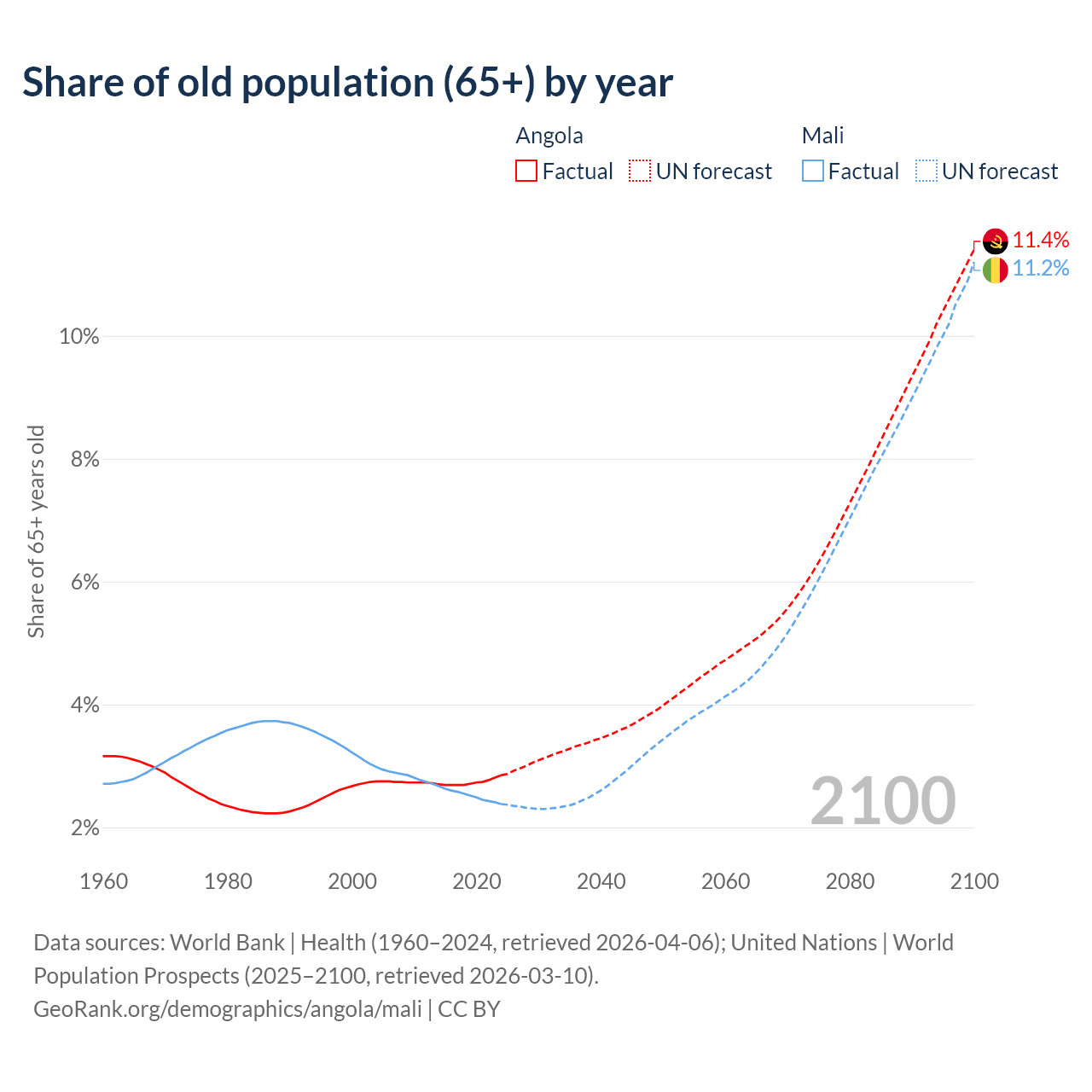 - The share of old-age demographic (65+) in Angola is 2.85% vs 2.38% in Mali.