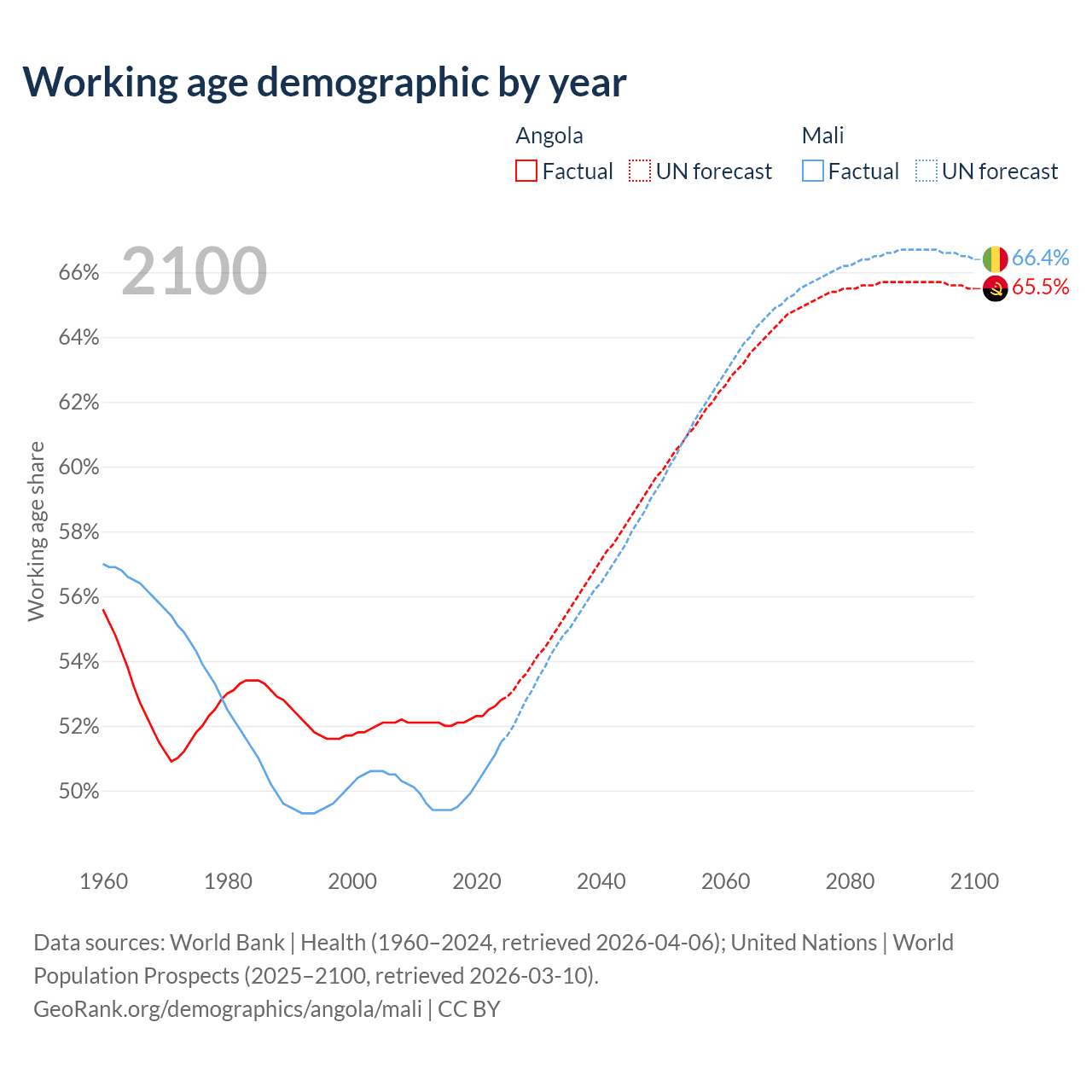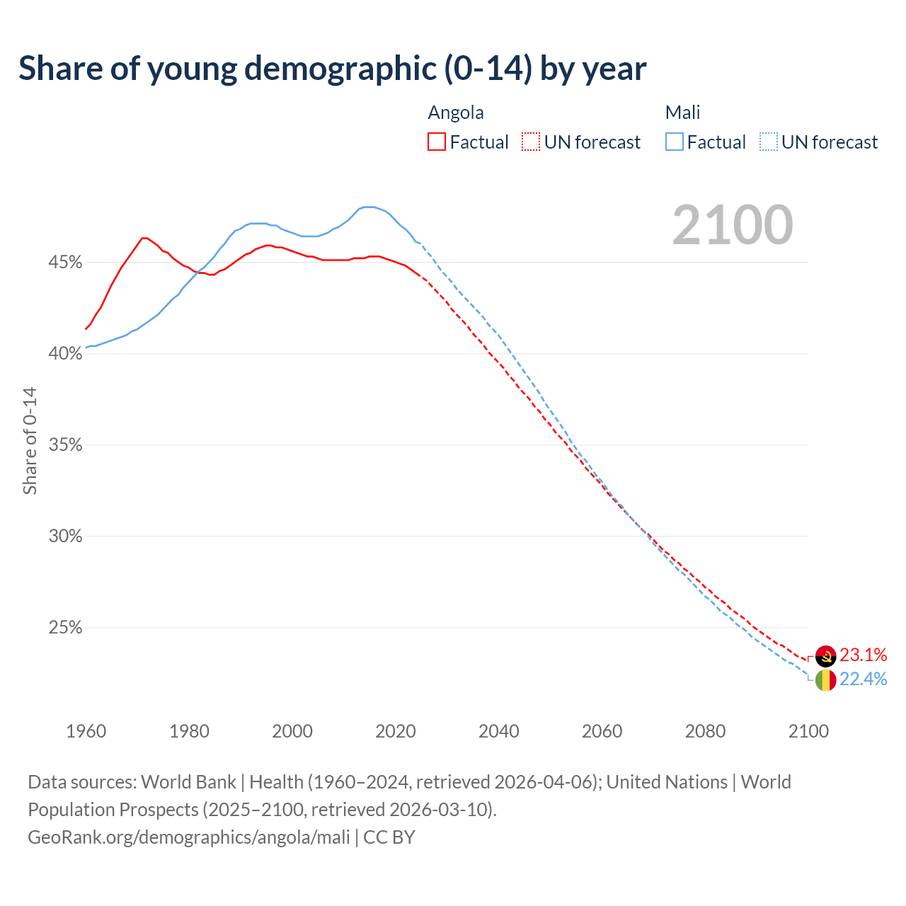 - As of 2026, the population of Angola is 40.6M vs 26.1M in Mali - 1.55 times difference.