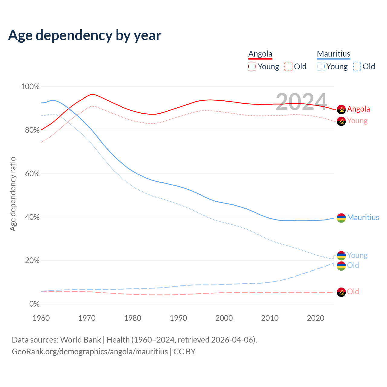 - Angola is ranked 188/196 by median age (oldest to youngest) vs 57/196 for Mauritius.