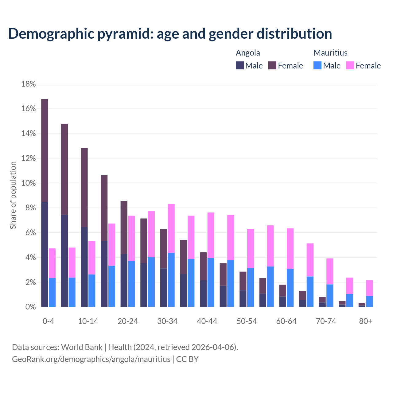 - As of 2026, the population of Angola is 40.6M vs 1.24M in Mauritius - 32.7 times difference.