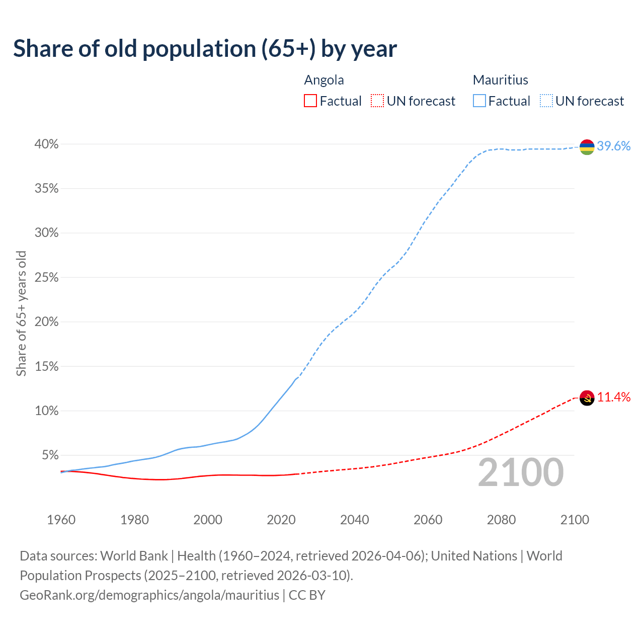 The share of older people aged 65 and over is 2.85% in Angola and 13.5% in Mauritius. Life expectancy in Angola compared to Mauritius .