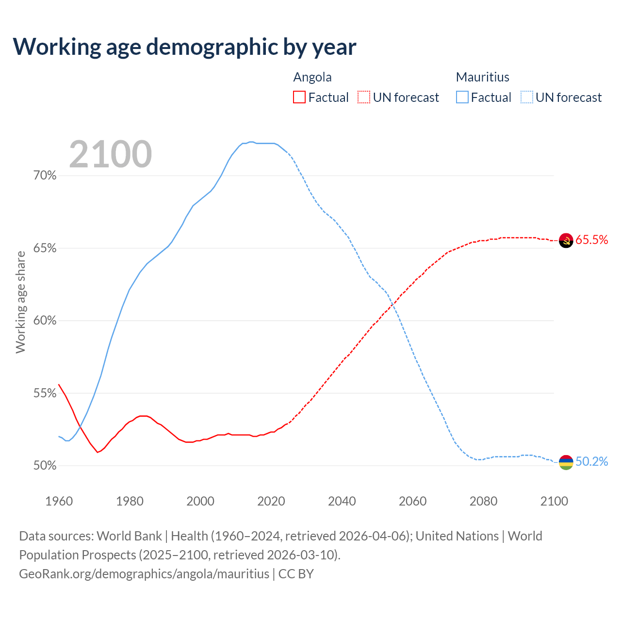 - Angola has 21.4M working age adults (aged 15-64) vs 889K in Mauritius.