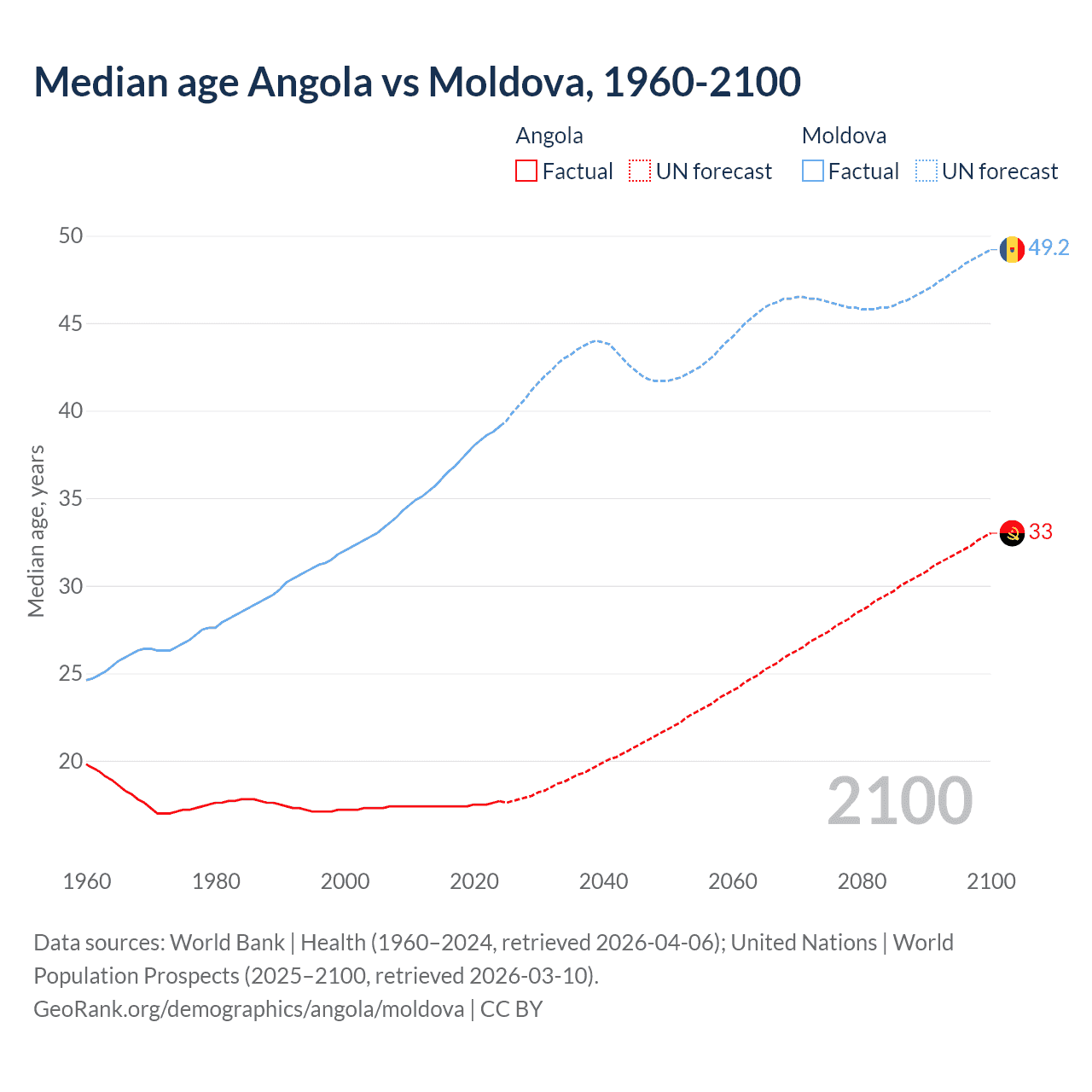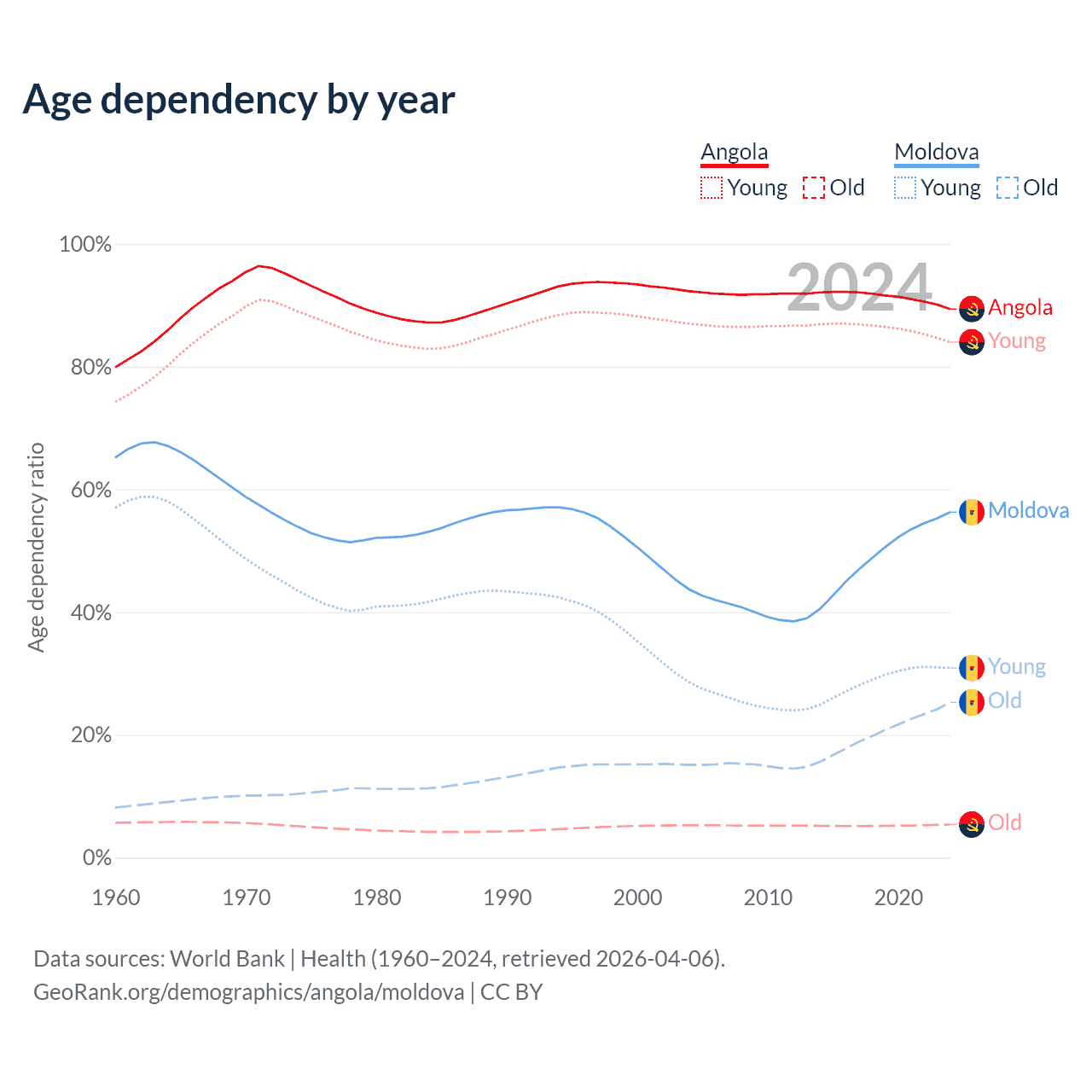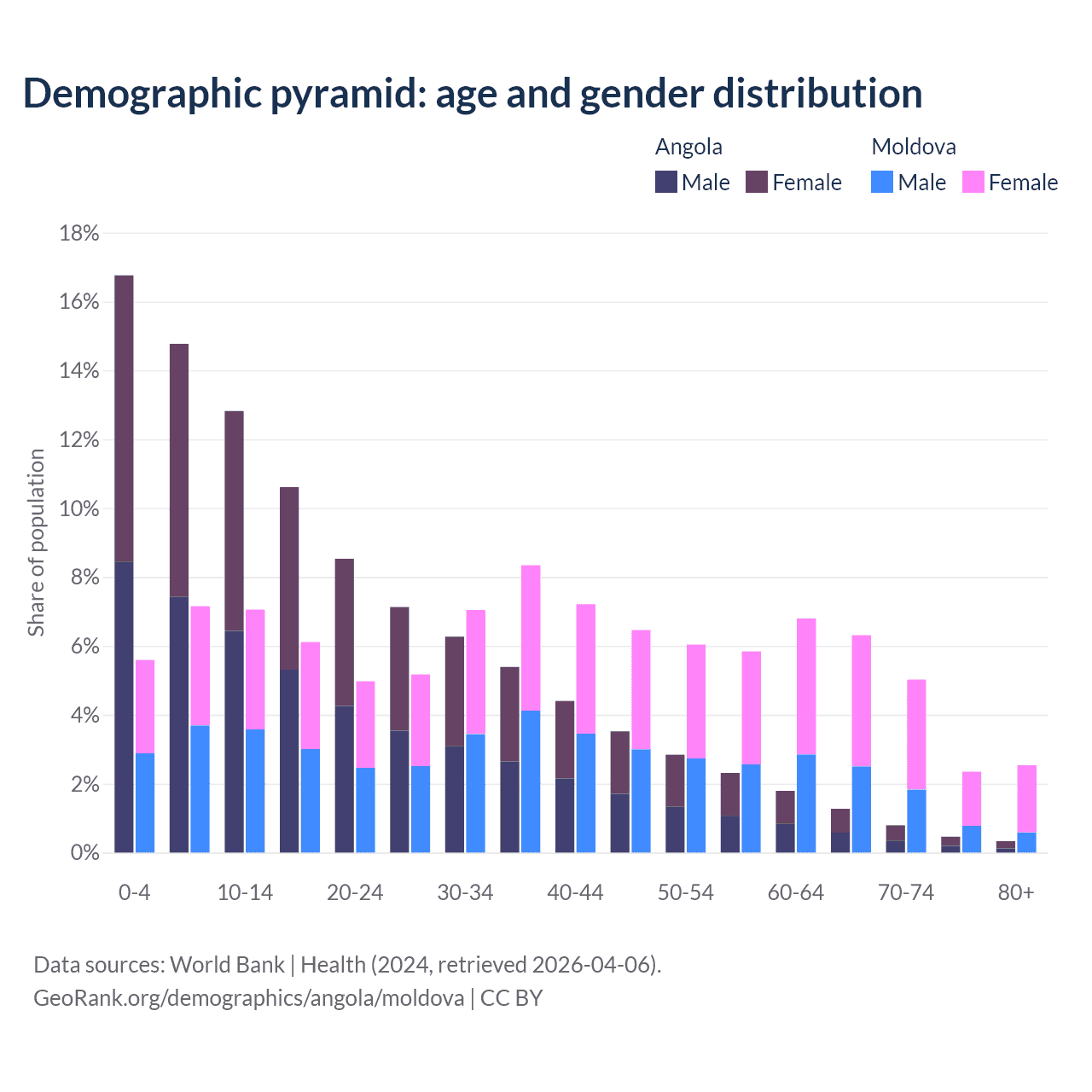 - Angola is ranked 188/196 by median age (oldest to youngest) vs 54/196 for Moldova.