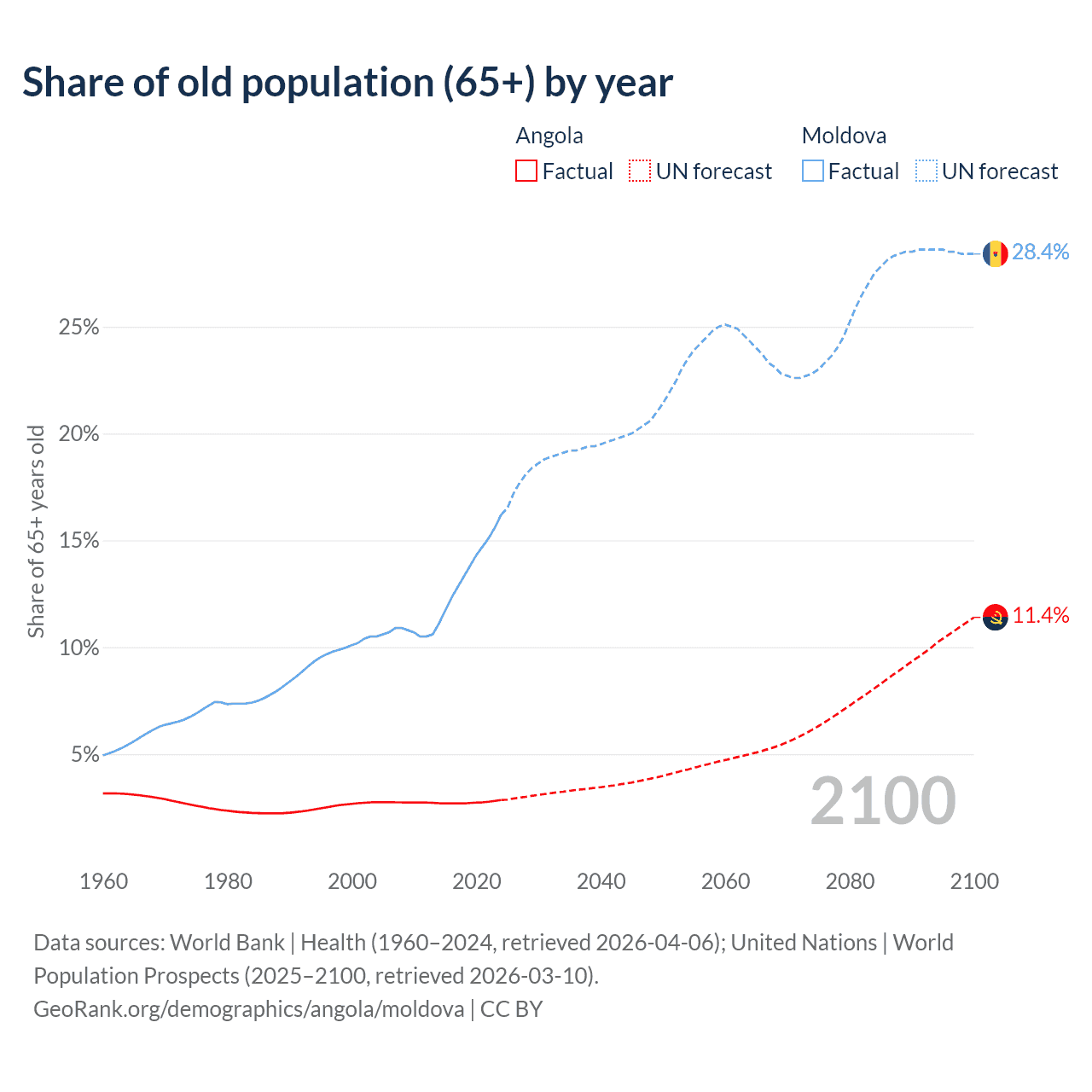 The share of older people aged 65 and over is 2.85% in Angola and 16.2% in Moldova. Life expectancy in Angola compared to Moldova .