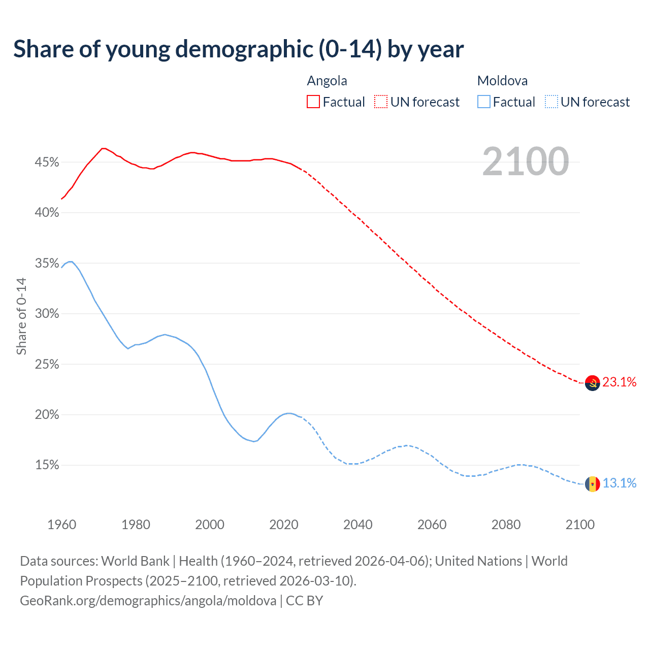 - The share of young demographic (0-15 years old) in Angola is 44.4% vs 19.8% in Moldova.