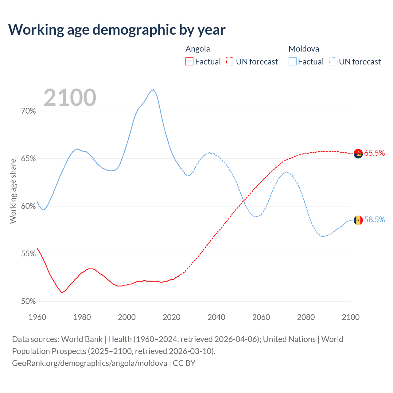 - Angola has 21.4M working age adults (aged 15-64) vs 1.5M in Moldova.
