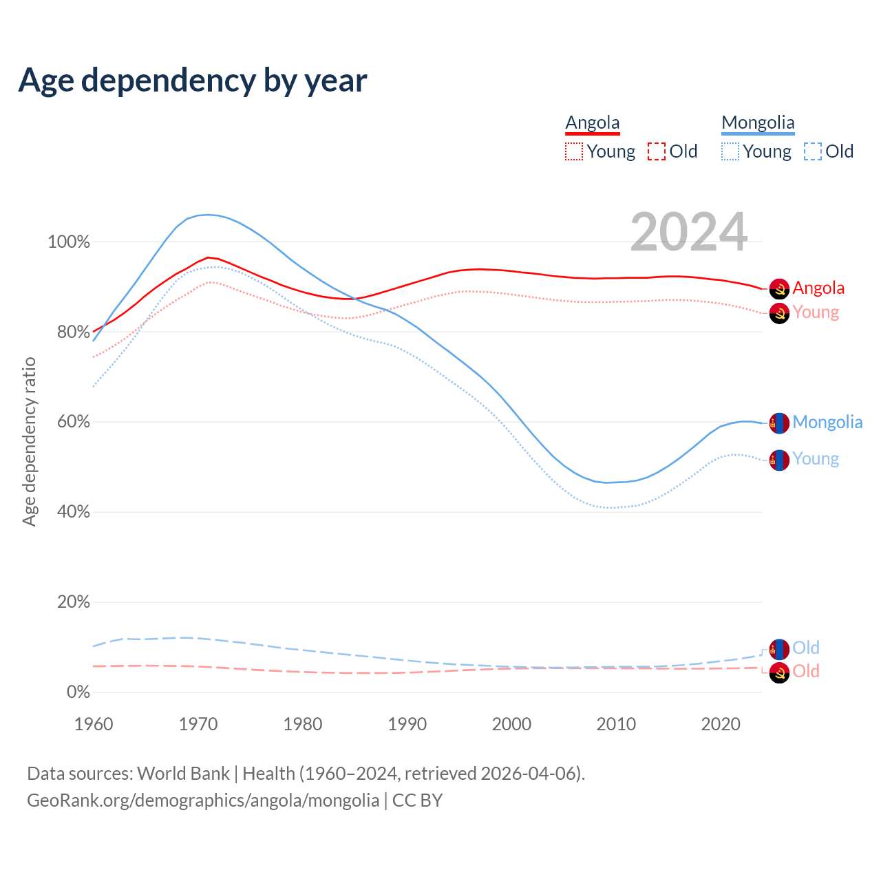 - Angola is ranked 188/196 by median age (oldest to youngest) vs 117/196 for Mongolia.