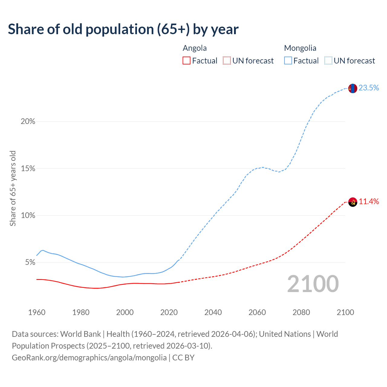 - The share of old-age demographic (65+) in Angola is 2.85% vs 5.14% in Mongolia.