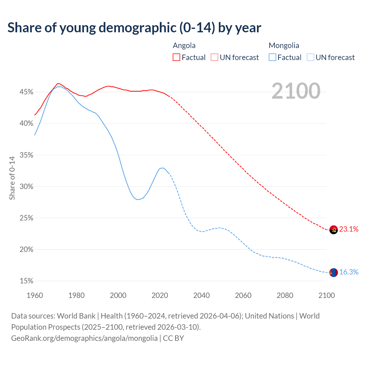 - The share of young demographic (0-15 years old) in Angola is 44.4% vs 32.2% in Mongolia.