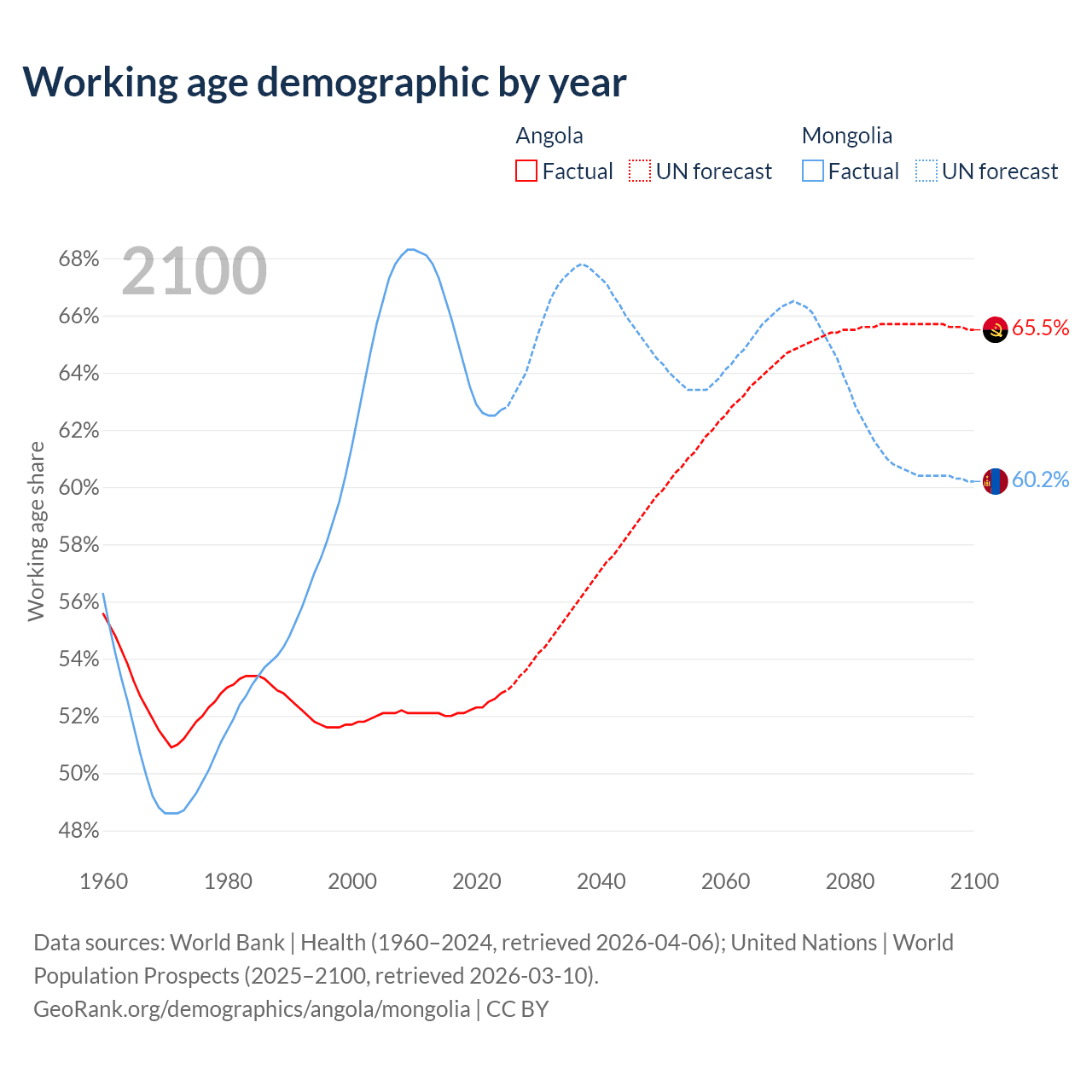- Angola has 21.4M working age adults (aged 15-64) vs 2.27M in Mongolia.