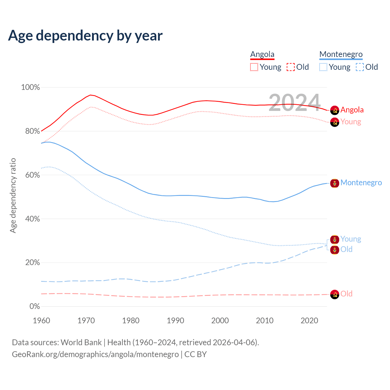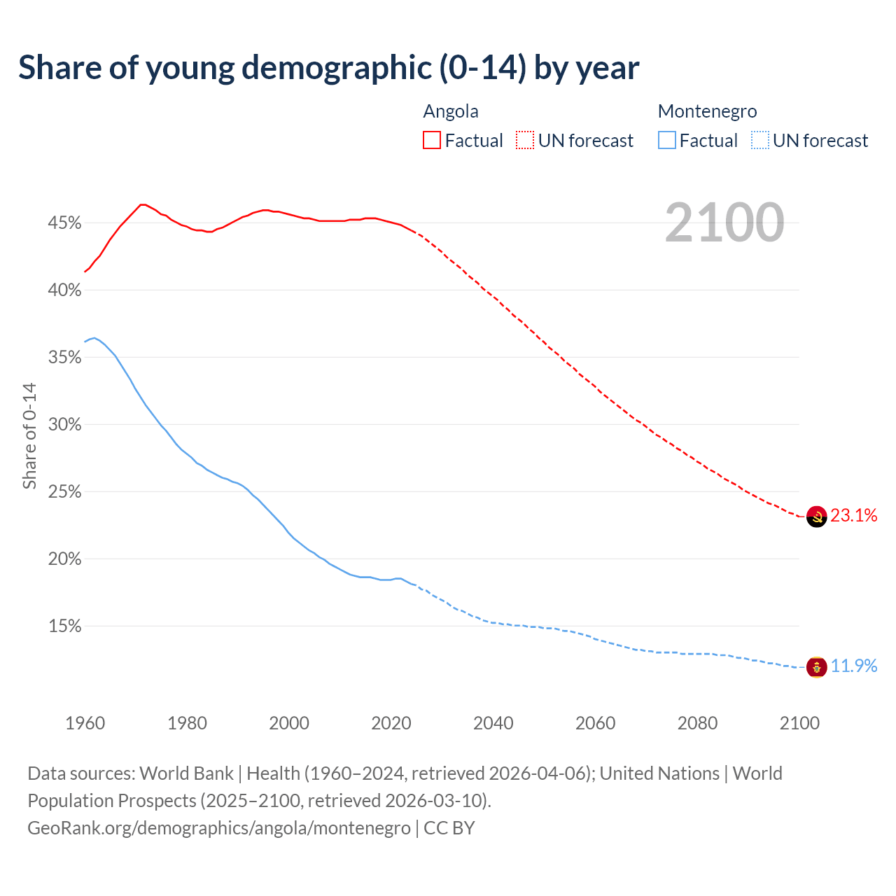 - The share of young demographic (0-15 years old) in Angola is 44.4% vs 18.1% in Montenegro.