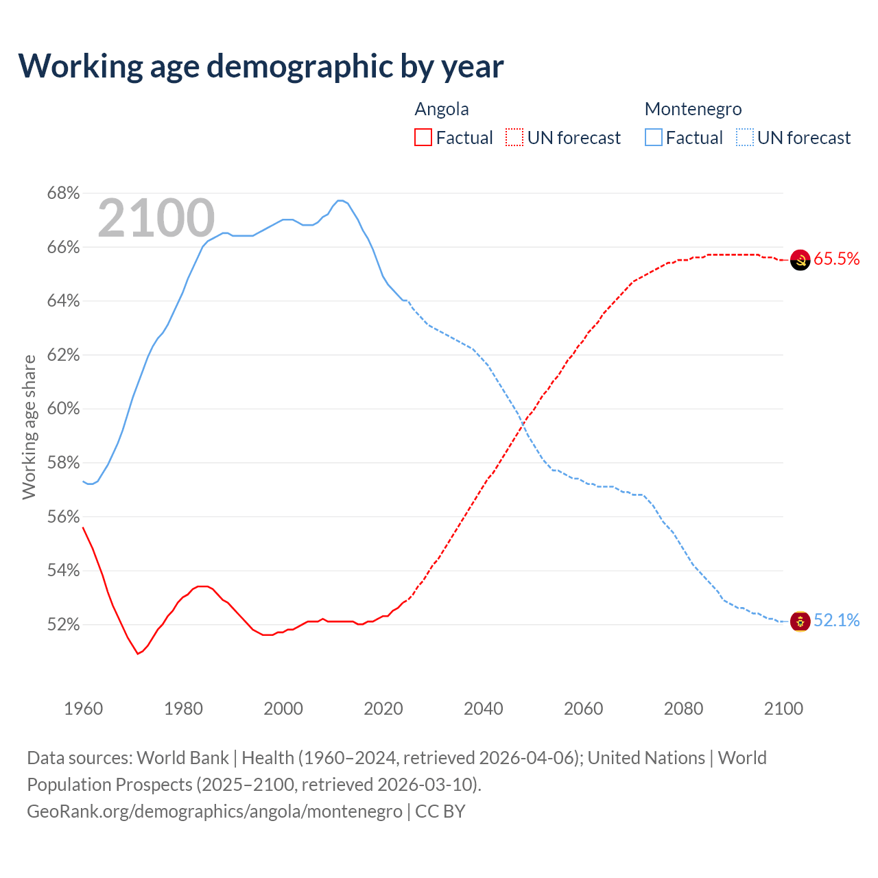 The share of older people aged 65 and over is 2.85% in Angola and 17.8% in Montenegro. Life expectancy in Angola compared to Montenegro .