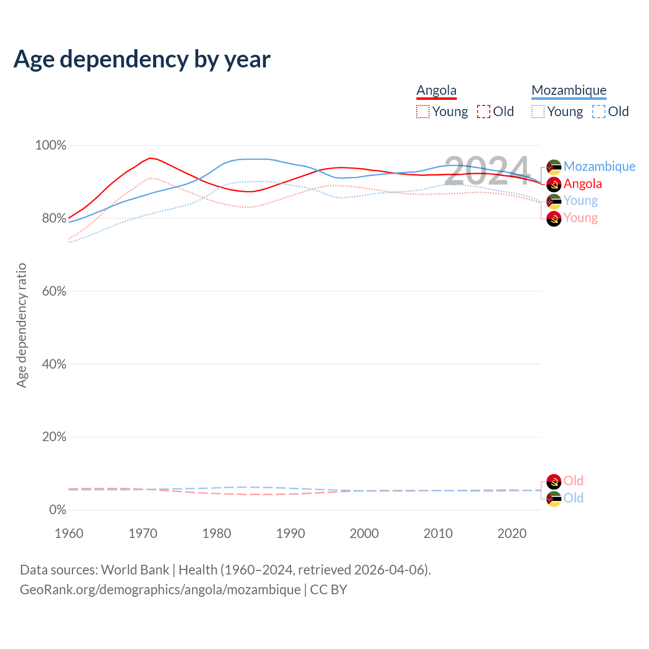 Data sources: World Bank | Health (1960–2024, retrieved 2026-04-06); U.S. Census Bureau (1960–2024, retrieved 2026-02-08).