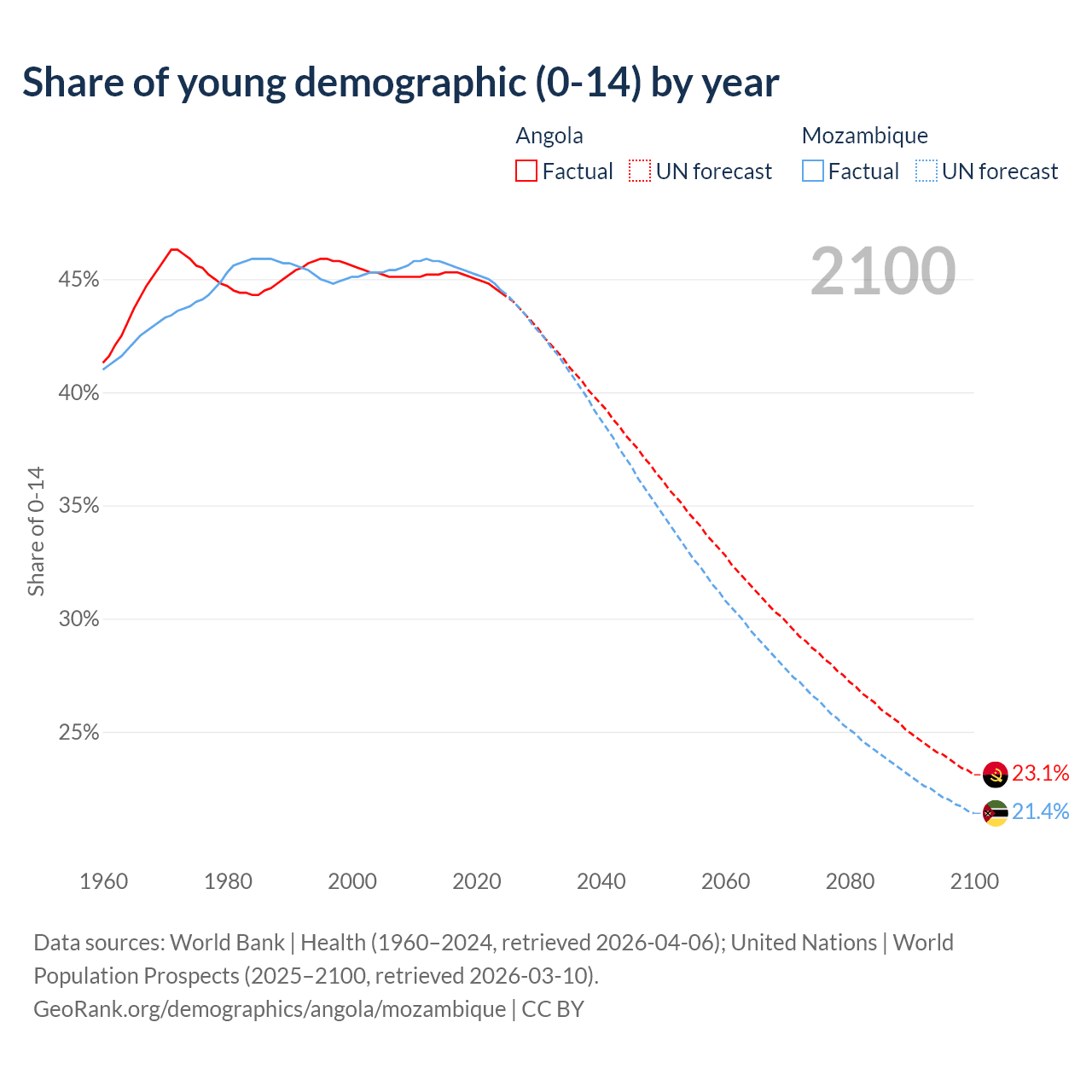 - The share of young demographic (0-15 years old) in Angola is 44.4% vs 44.5% in Mozambique.