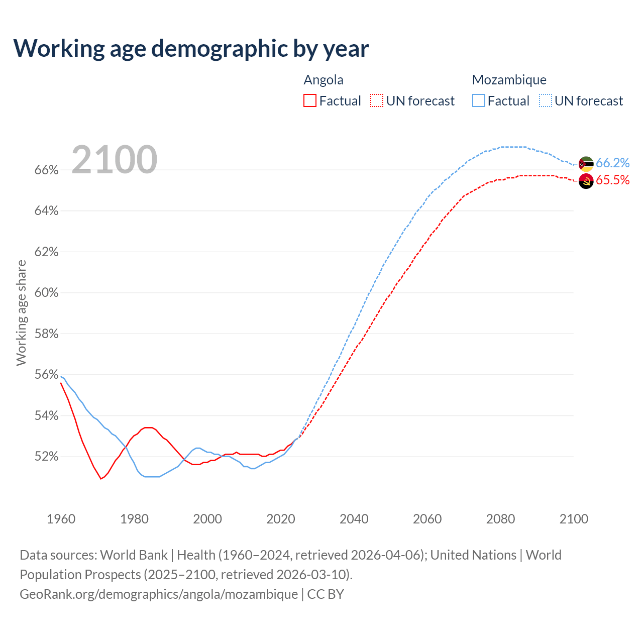 - Angola has 21.4M working age adults (aged 15-64) vs 19.5M in Mozambique.