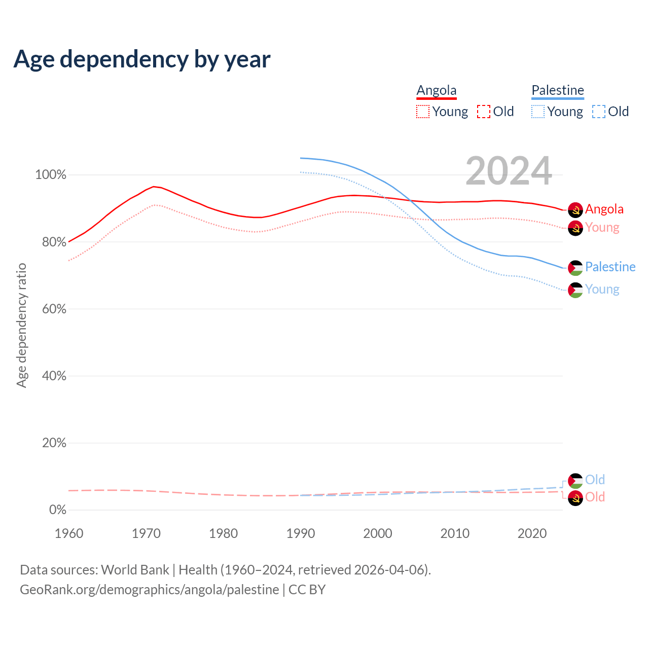 - Angola is ranked 188/196 by median age (oldest to youngest) vs 157/196 for Palestine.
