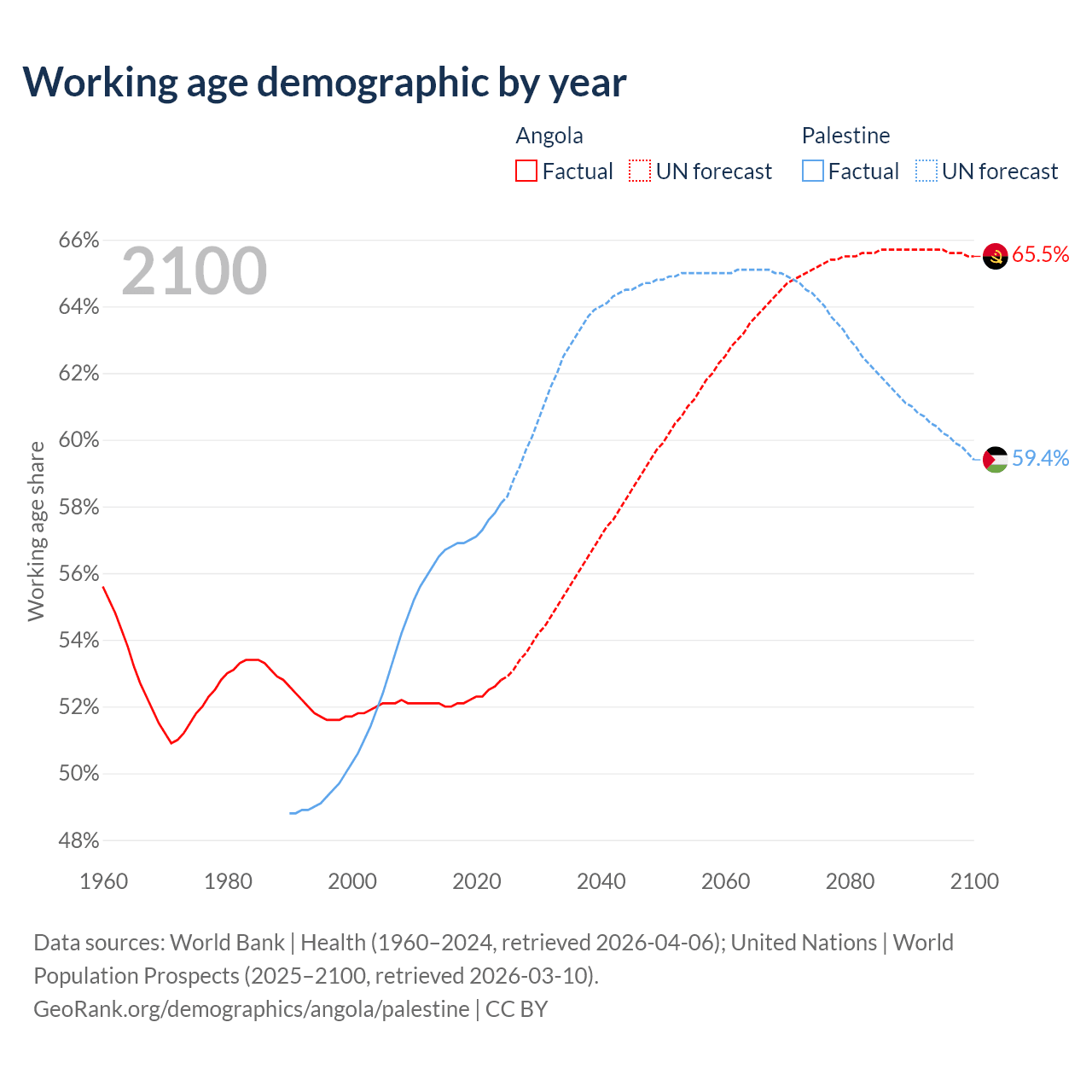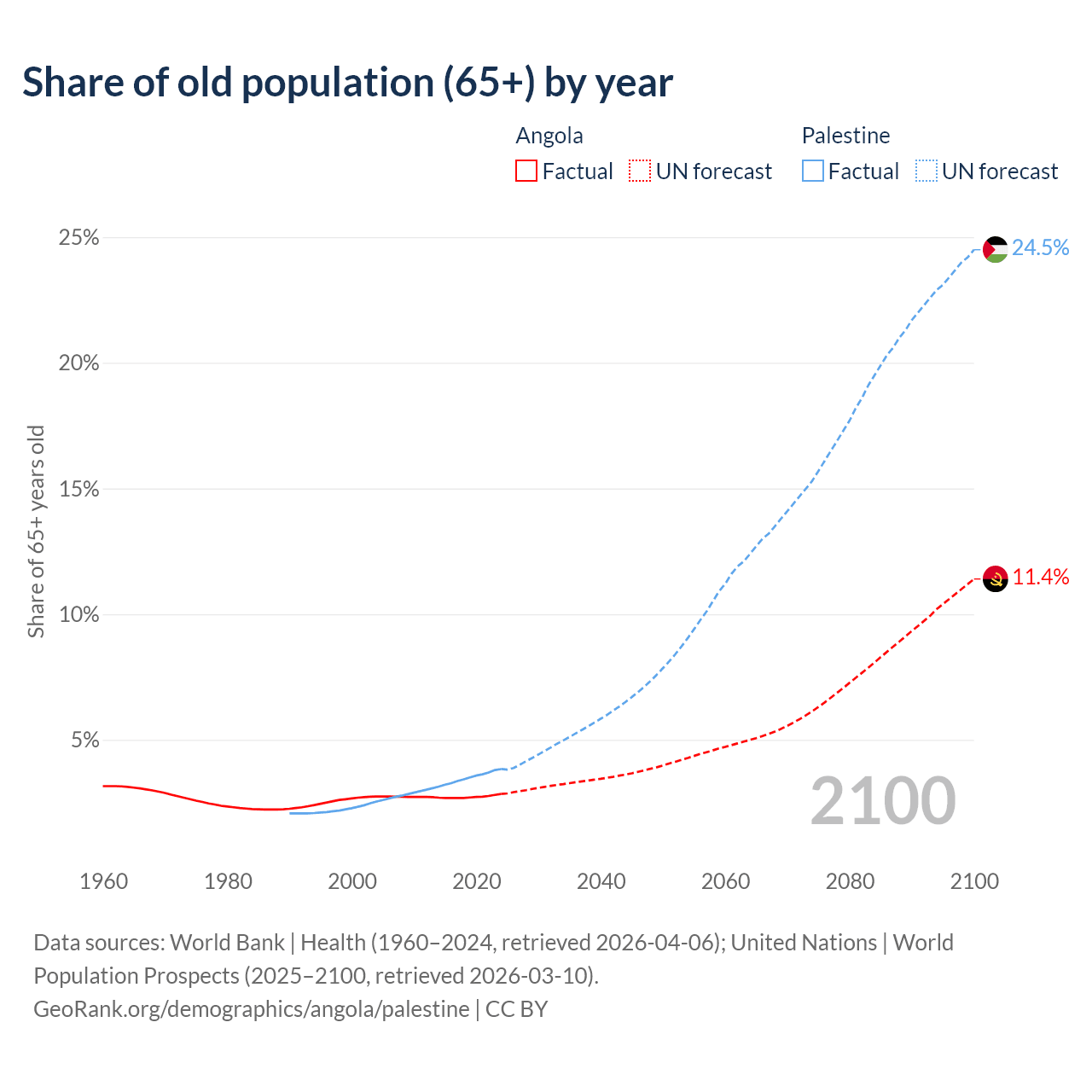 The share of older people aged 65 and over is 2.85% in Angola and 3.84% in Palestine. Life expectancy in Angola compared to Palestine .