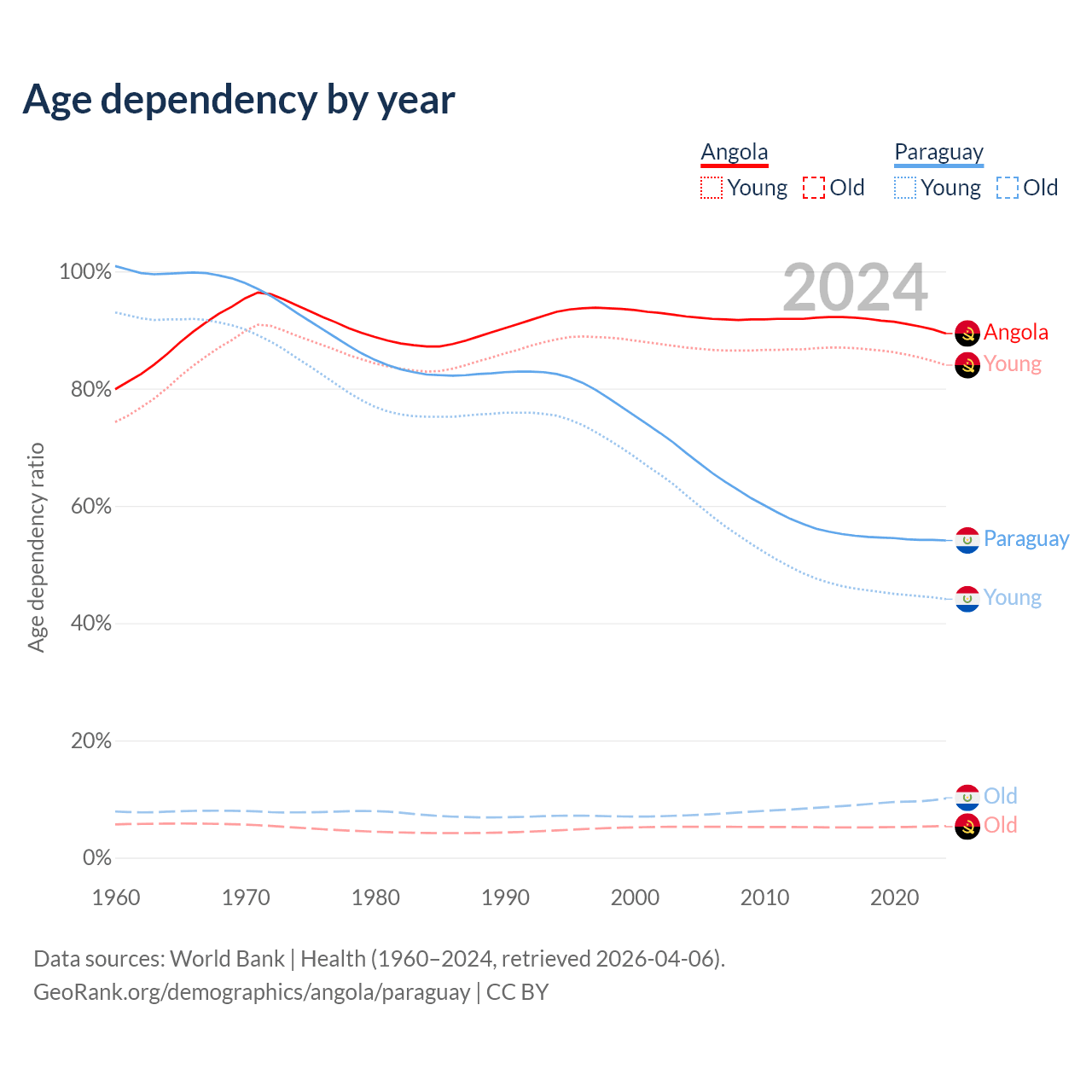 - Angola is ranked 188/196 by median age (oldest to youngest) vs 118/196 for Paraguay.