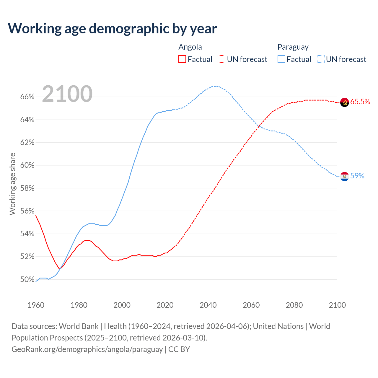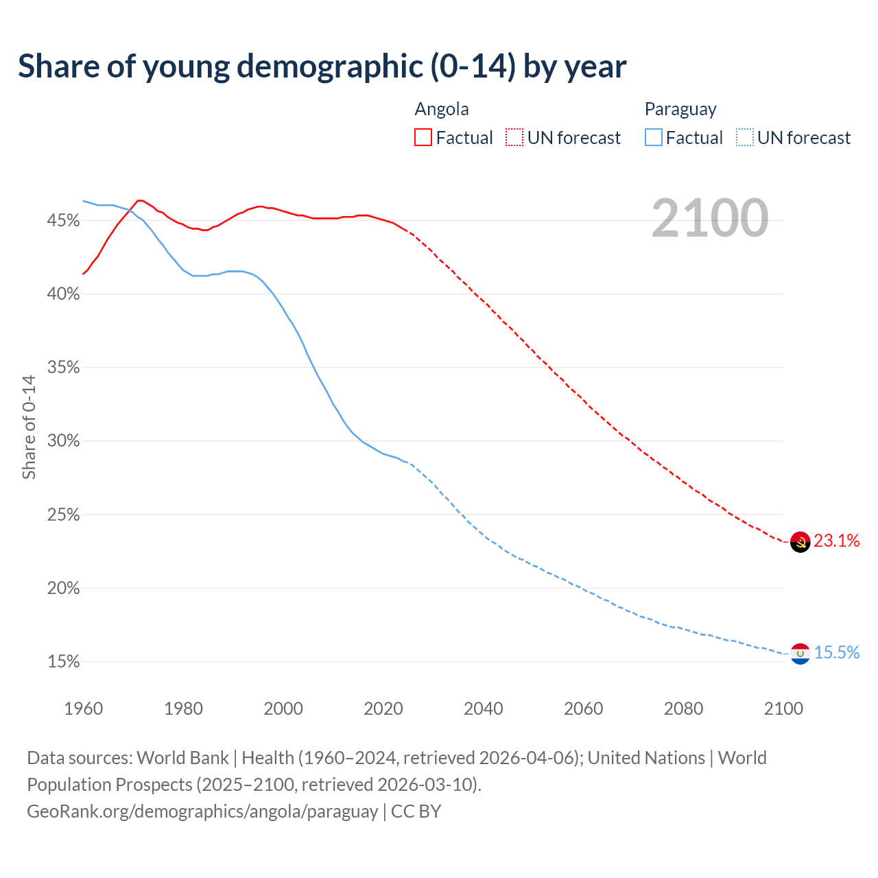 - As of 2026, the population of Angola is 40.6M vs 7.12M in Paraguay - 5.7 times difference.