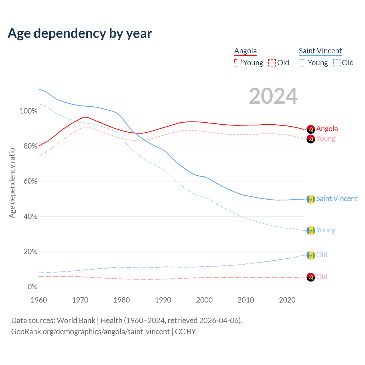 - Angola is ranked 188/196 by median age (oldest to youngest) vs 75/196 for Saint Vincent.