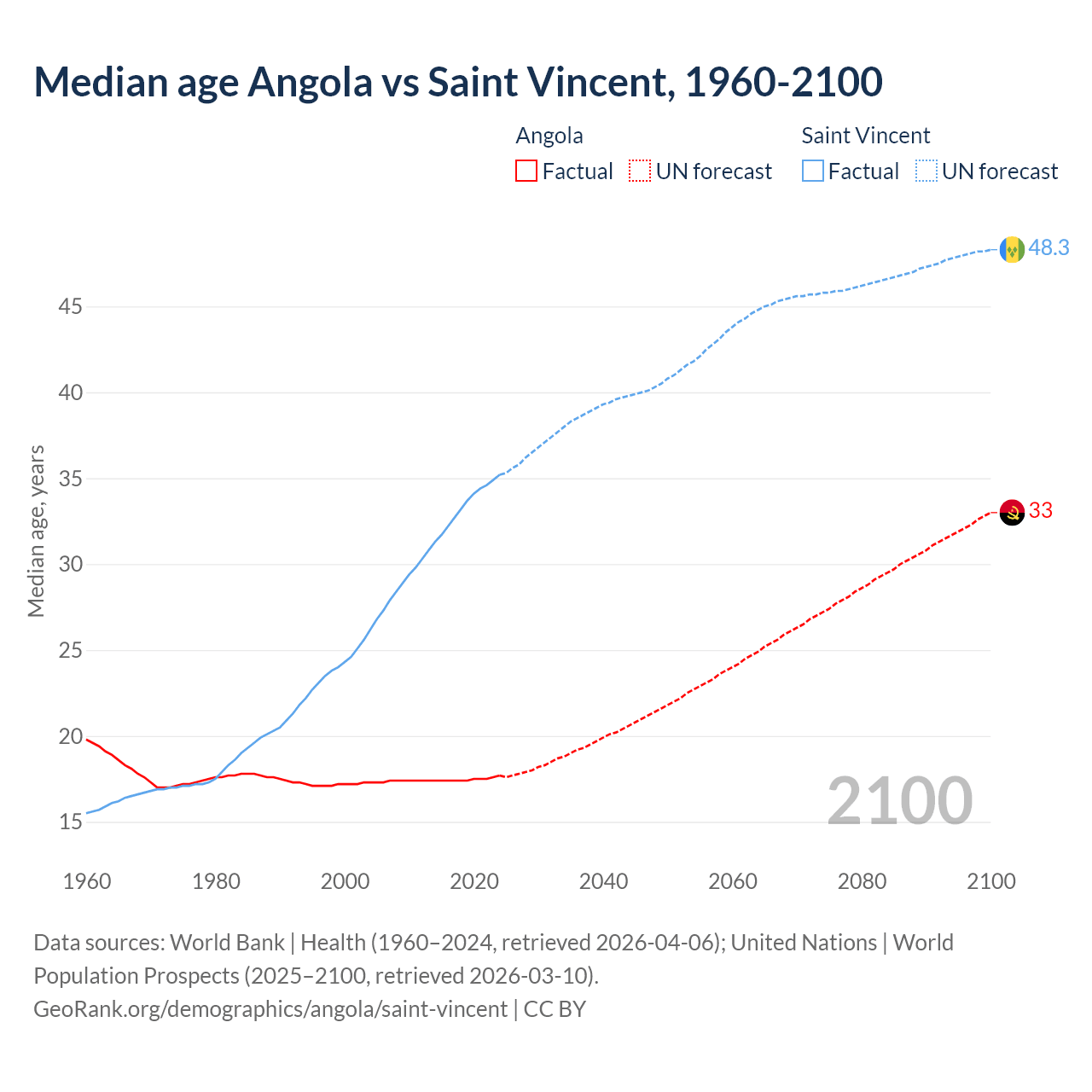 - The median age in Angola is 17.7 years compared to 35.2 years in Saint Vincent.