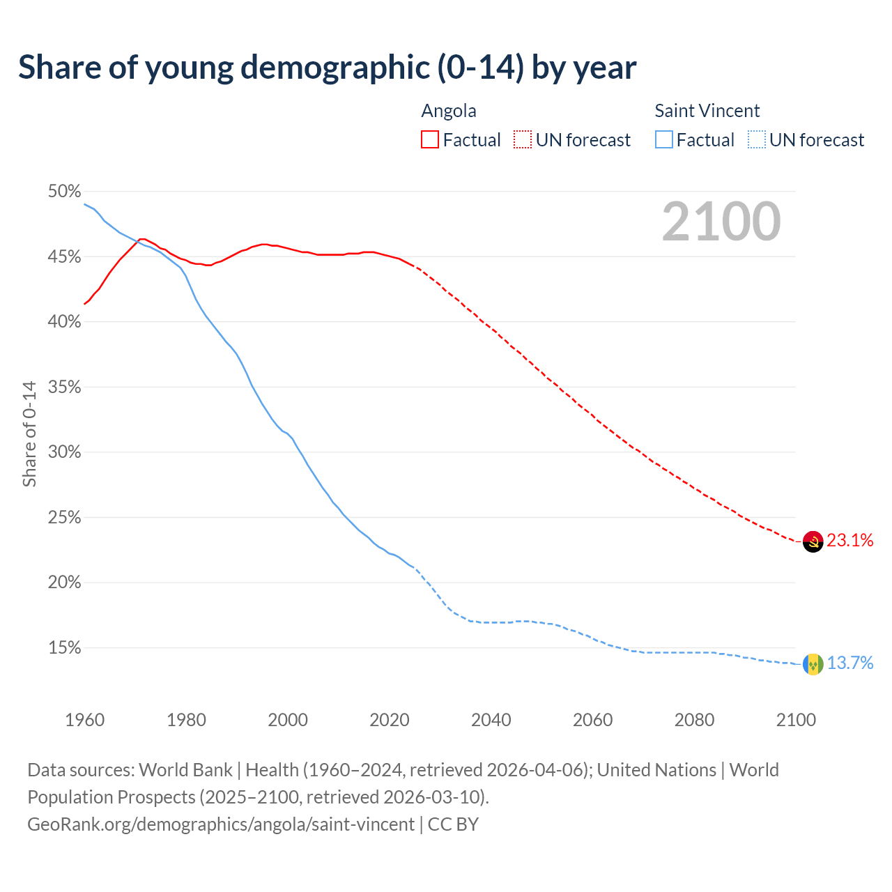 - The share of young demographic (0-15 years old) in Angola is 44.4% vs 21.3% in Saint Vincent.