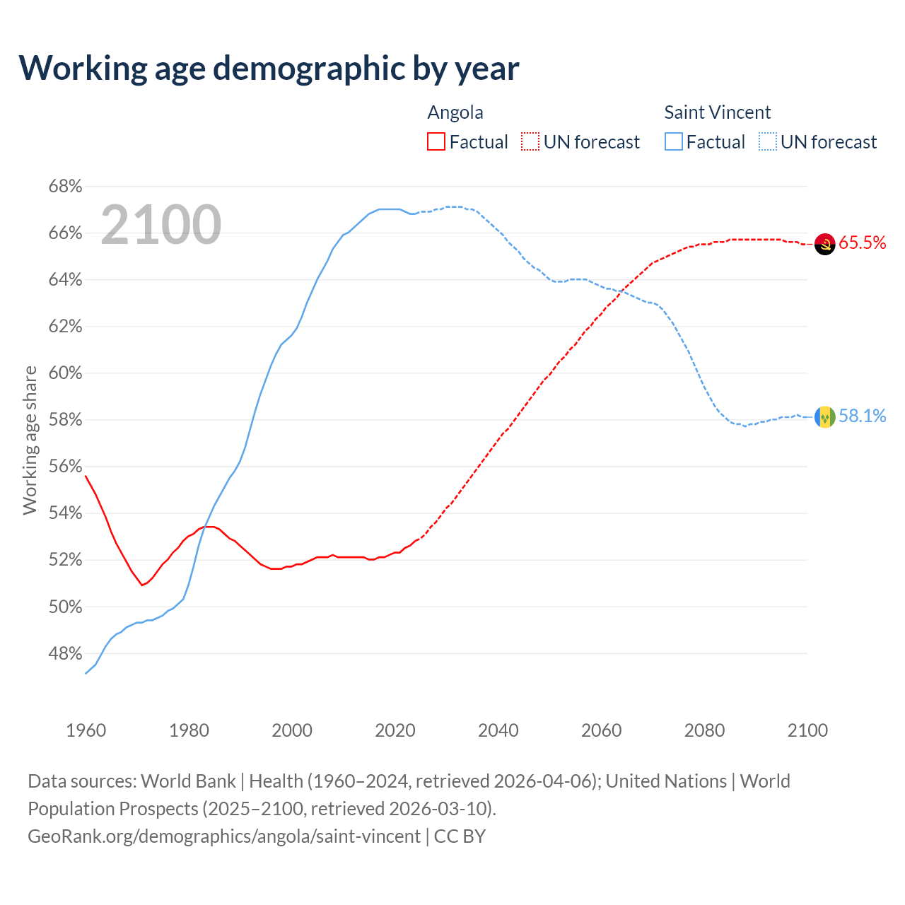 - Angola has 21.4M working age adults (aged 15-64) vs 66.3K in Saint Vincent.