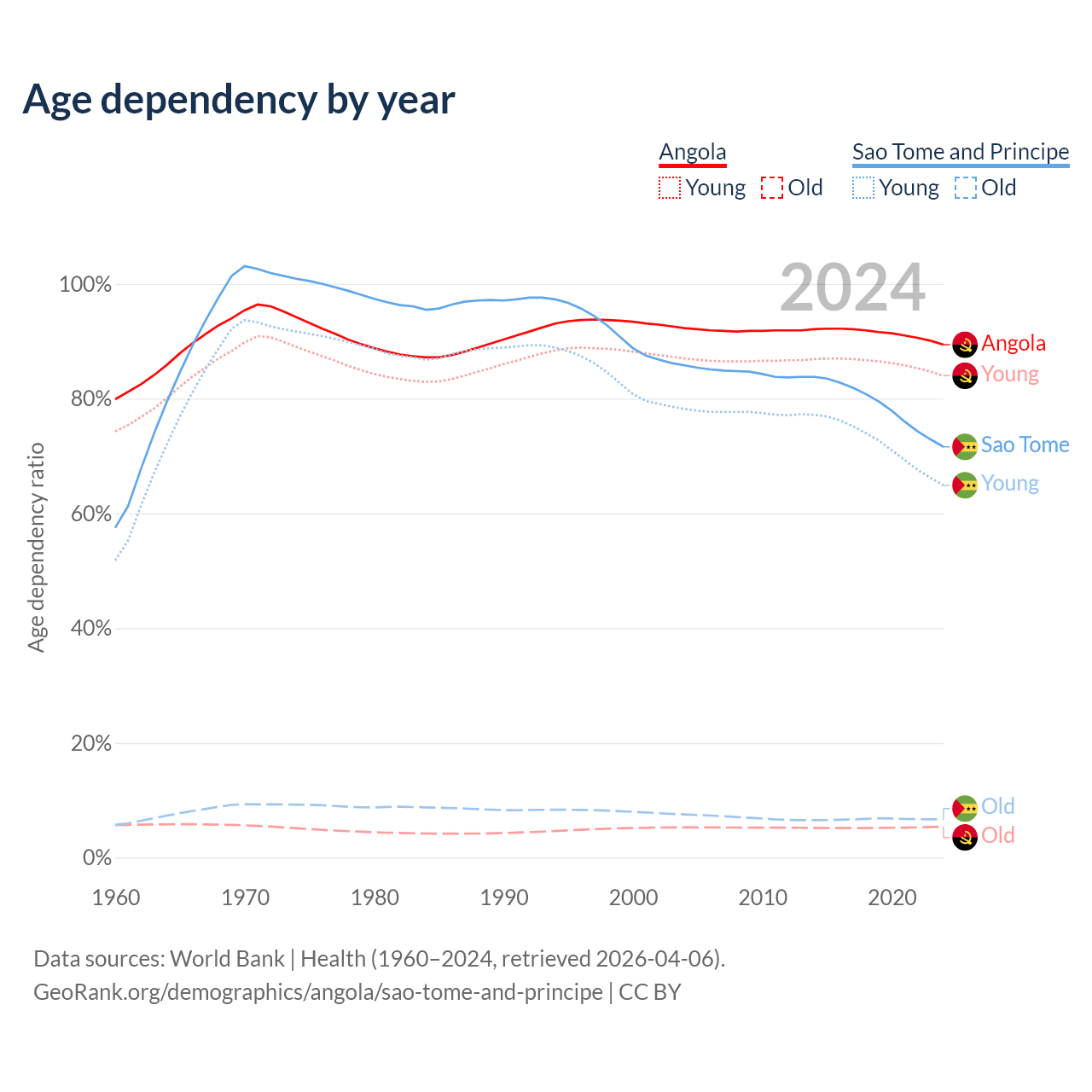 - Angola is ranked 188/196 by median age (oldest to youngest) vs 163/196 for Sao Tome and Principe.