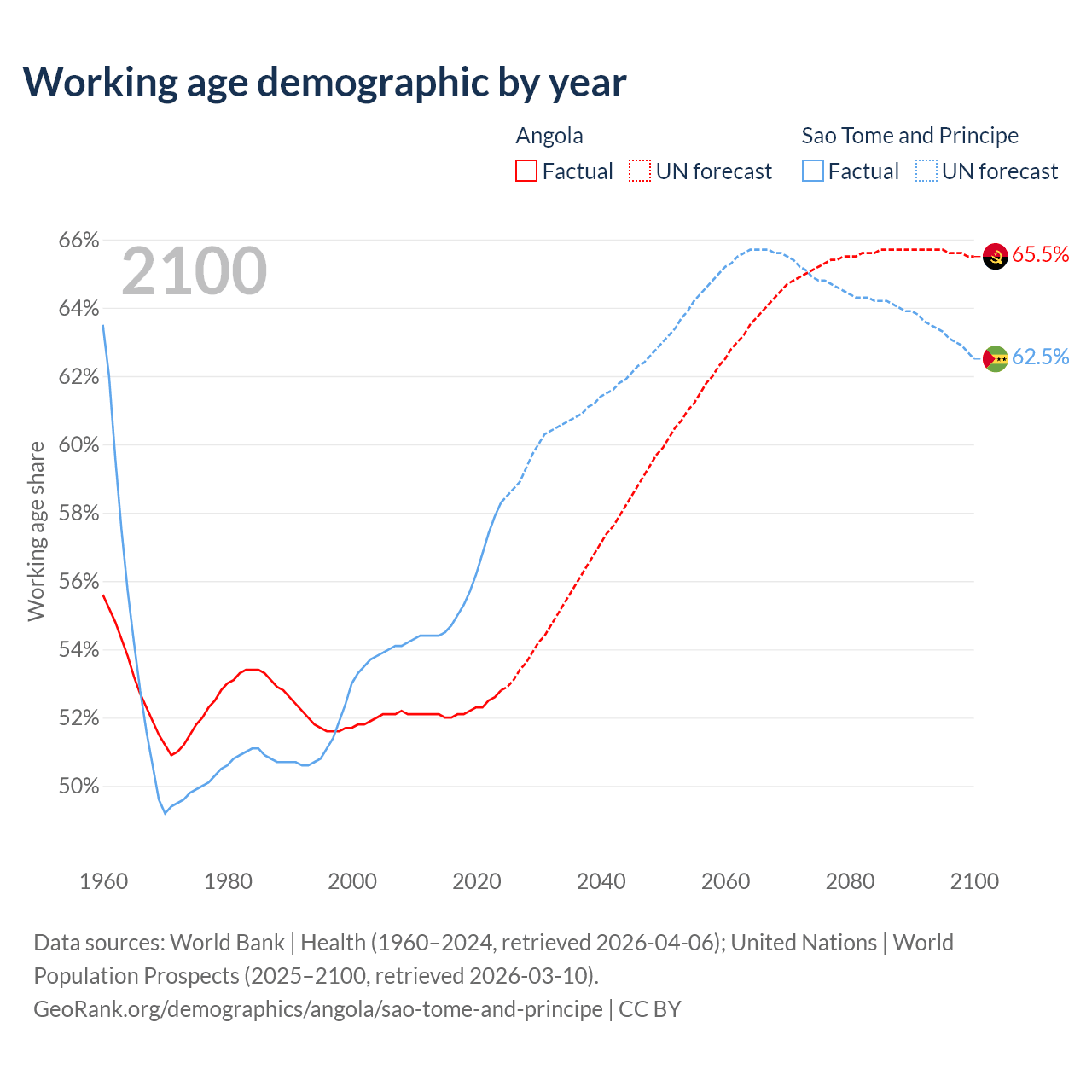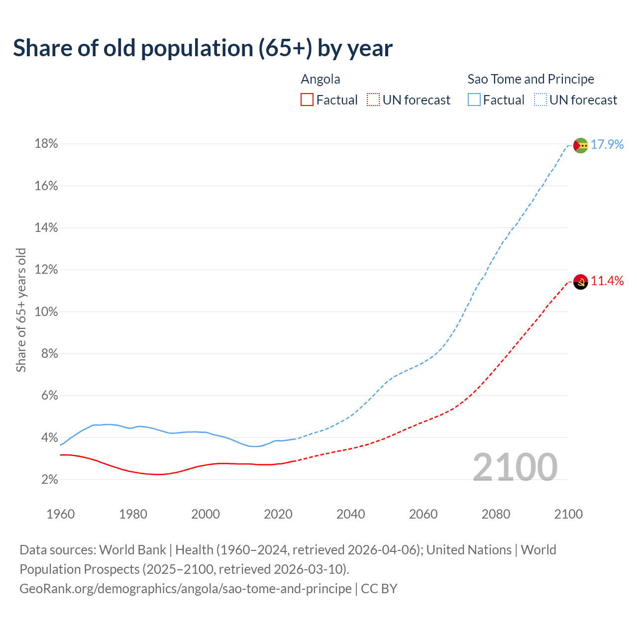The share of older people aged 65 and over is 2.85% in Angola and 3.9% in Sao Tome and Principe. Life expectancy in Angola compared to Sao Tome and Principe .