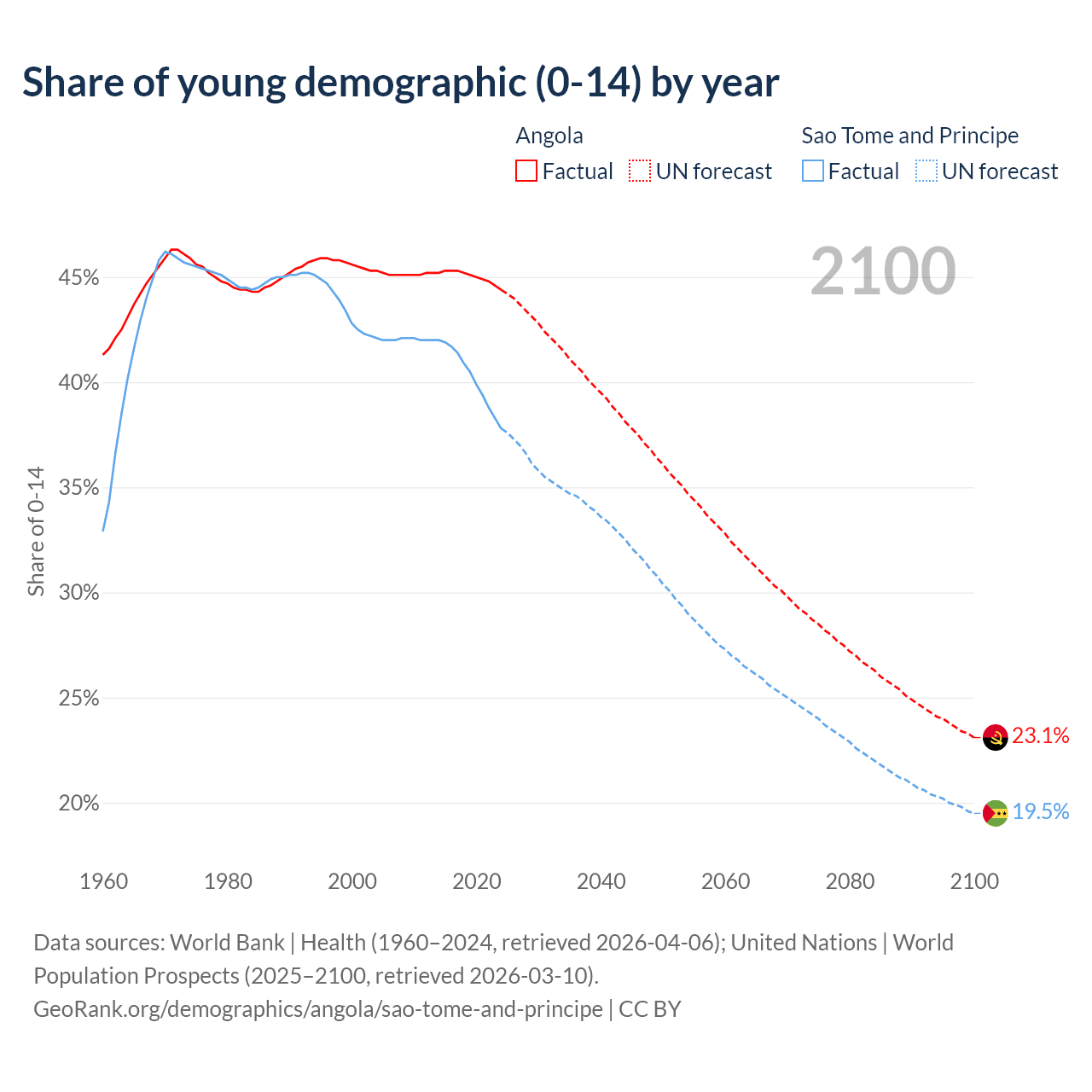 - The share of young demographic (0-15 years old) in Angola is 44.4% vs 37.8% in Sao Tome and Principe.