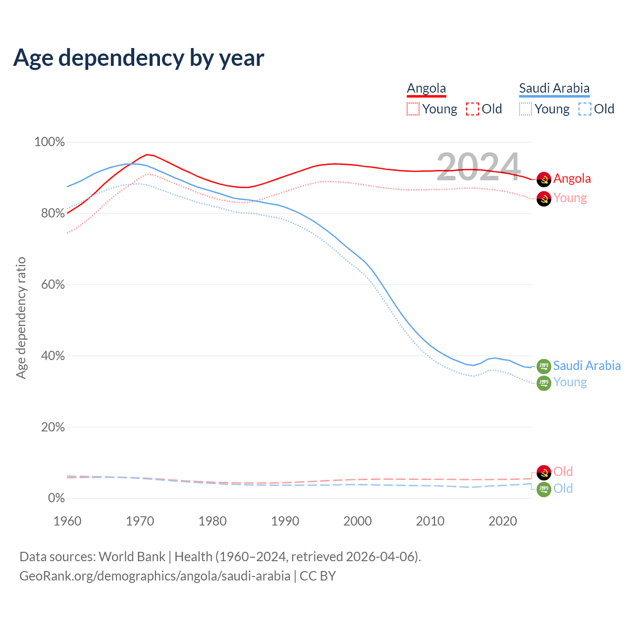 - Angola is ranked 188/196 by median age (oldest to youngest) vs 98/196 for Saudi Arabia.