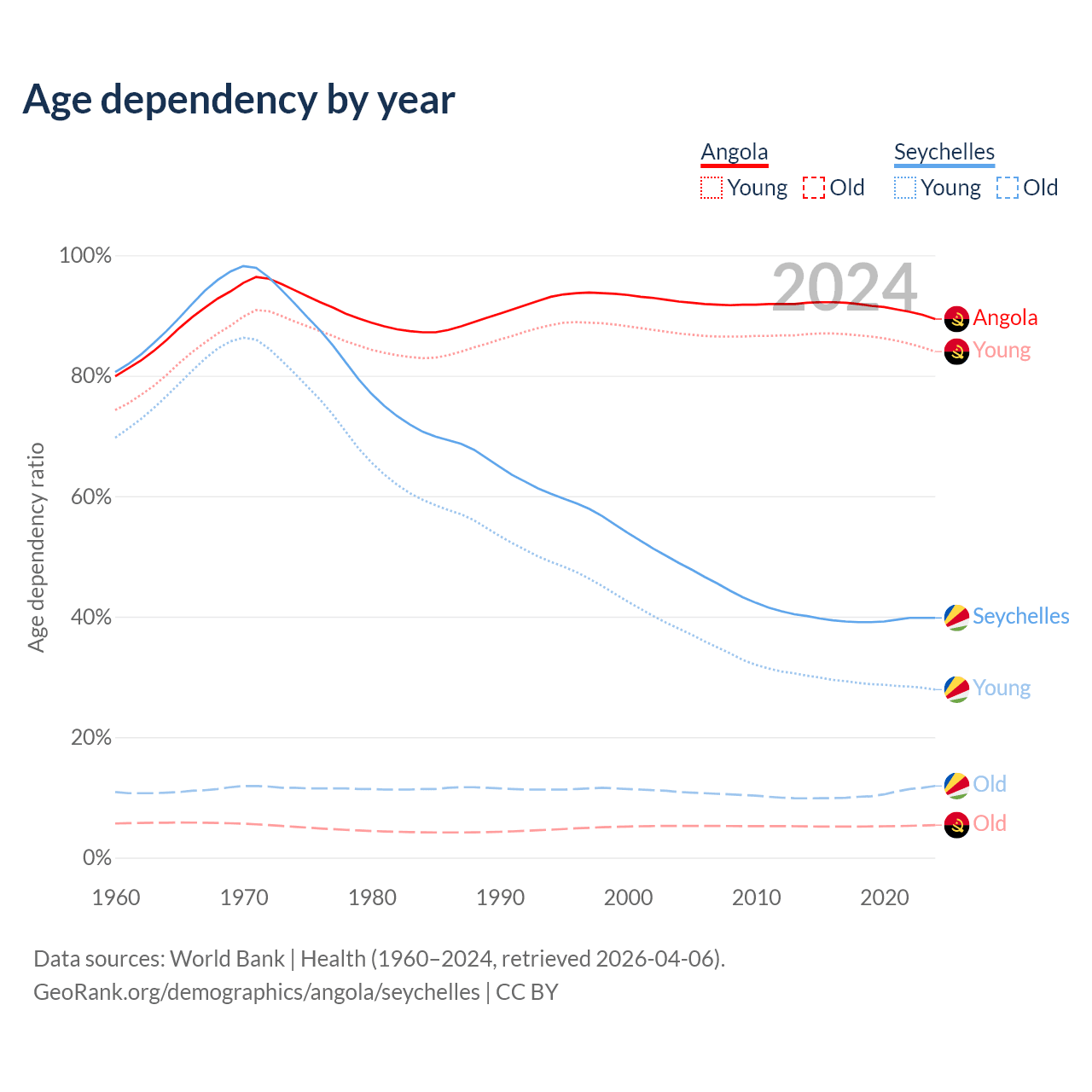 - Angola is ranked 188/196 by median age (oldest to youngest) vs 76/196 for the Seychelles.