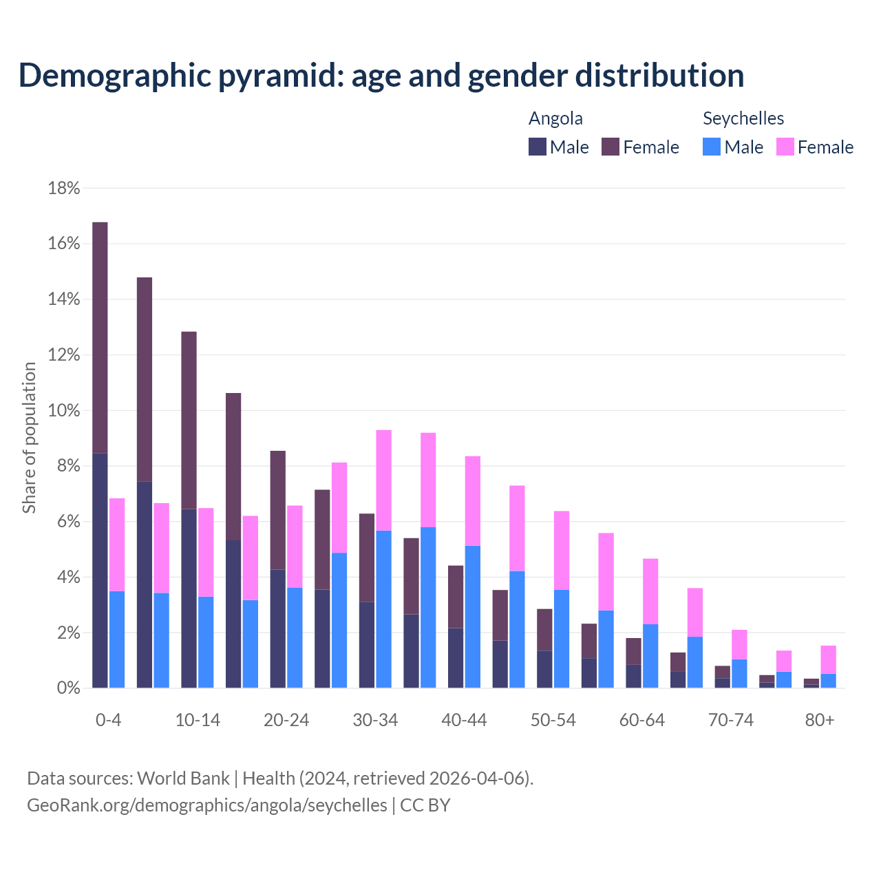 - As of 2026, the population of Angola is 40.6M vs 126K in the Seychelles - 321 times difference.
