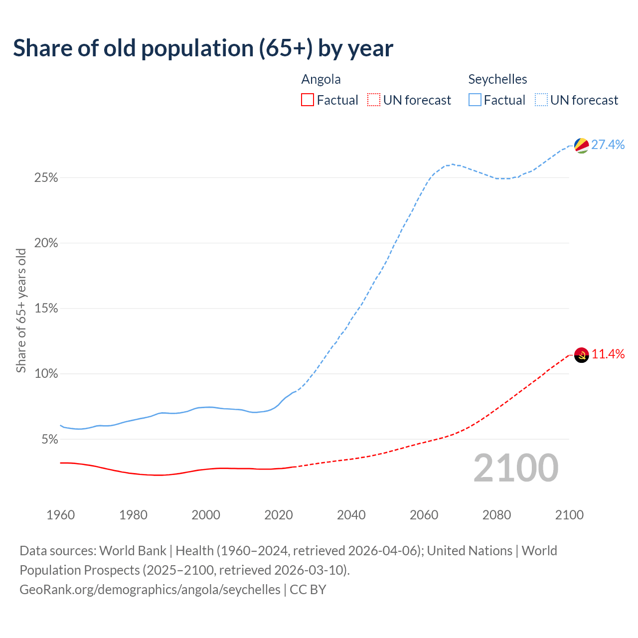 - The share of old-age demographic (65+) in Angola is 2.85% vs 8.54% in the Seychelles.