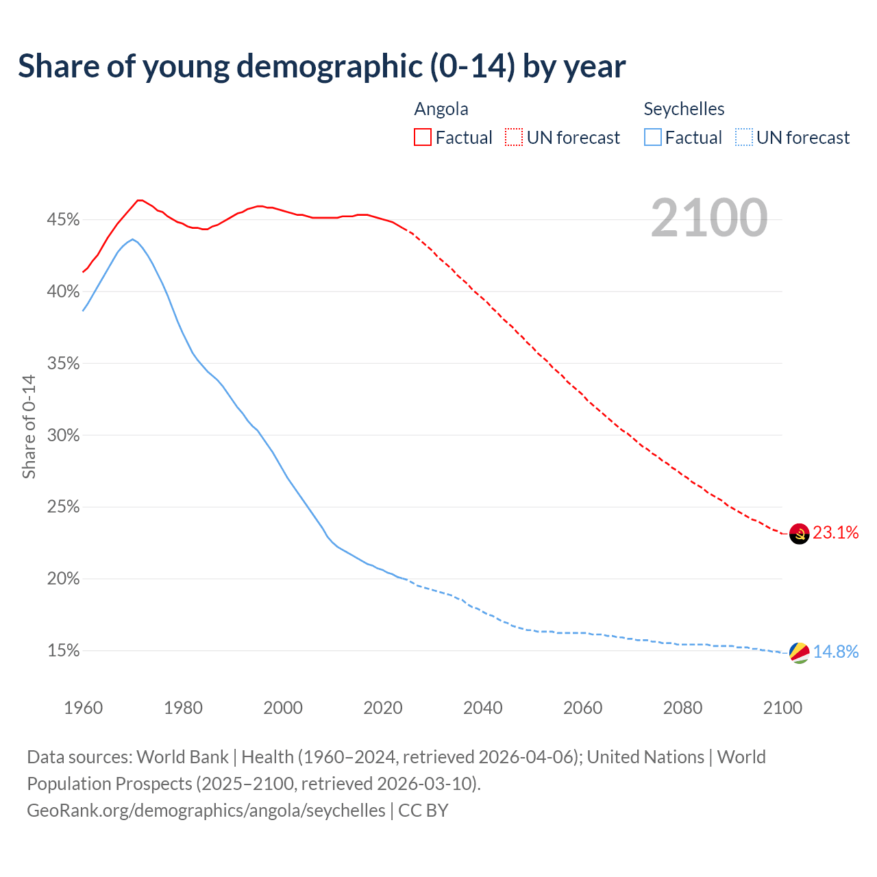 - The share of young demographic (0-15 years old) in Angola is 44.4% vs 20% in the Seychelles.