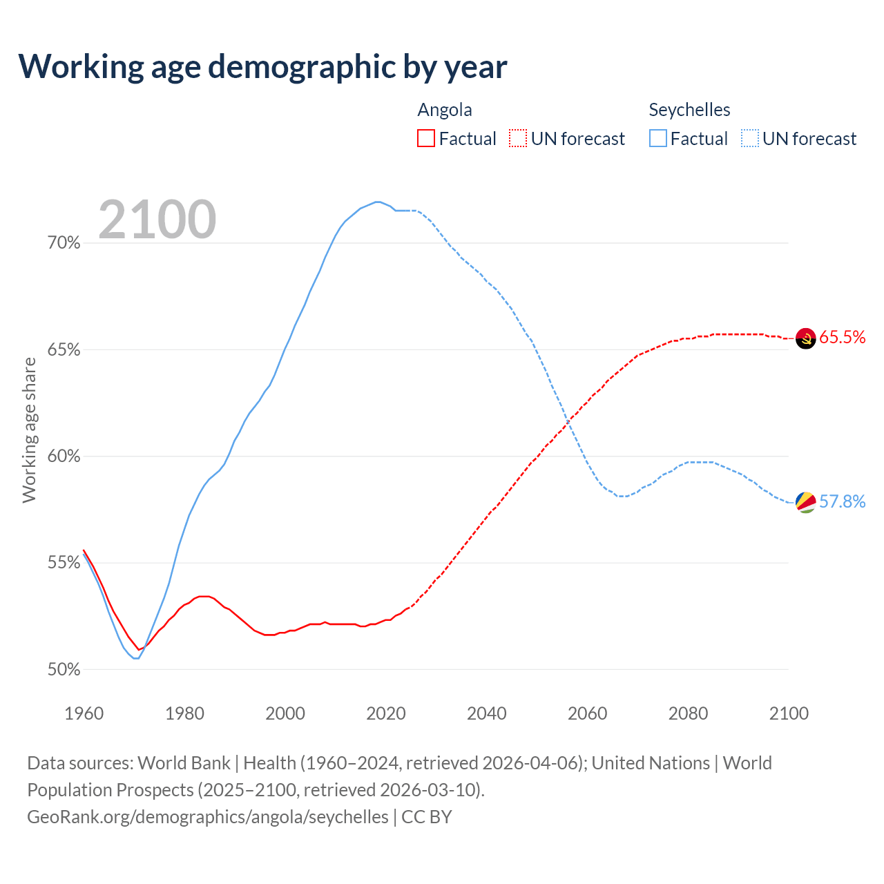 - Angola has 21.4M working age adults (aged 15-64) vs 90.3K in the Seychelles.