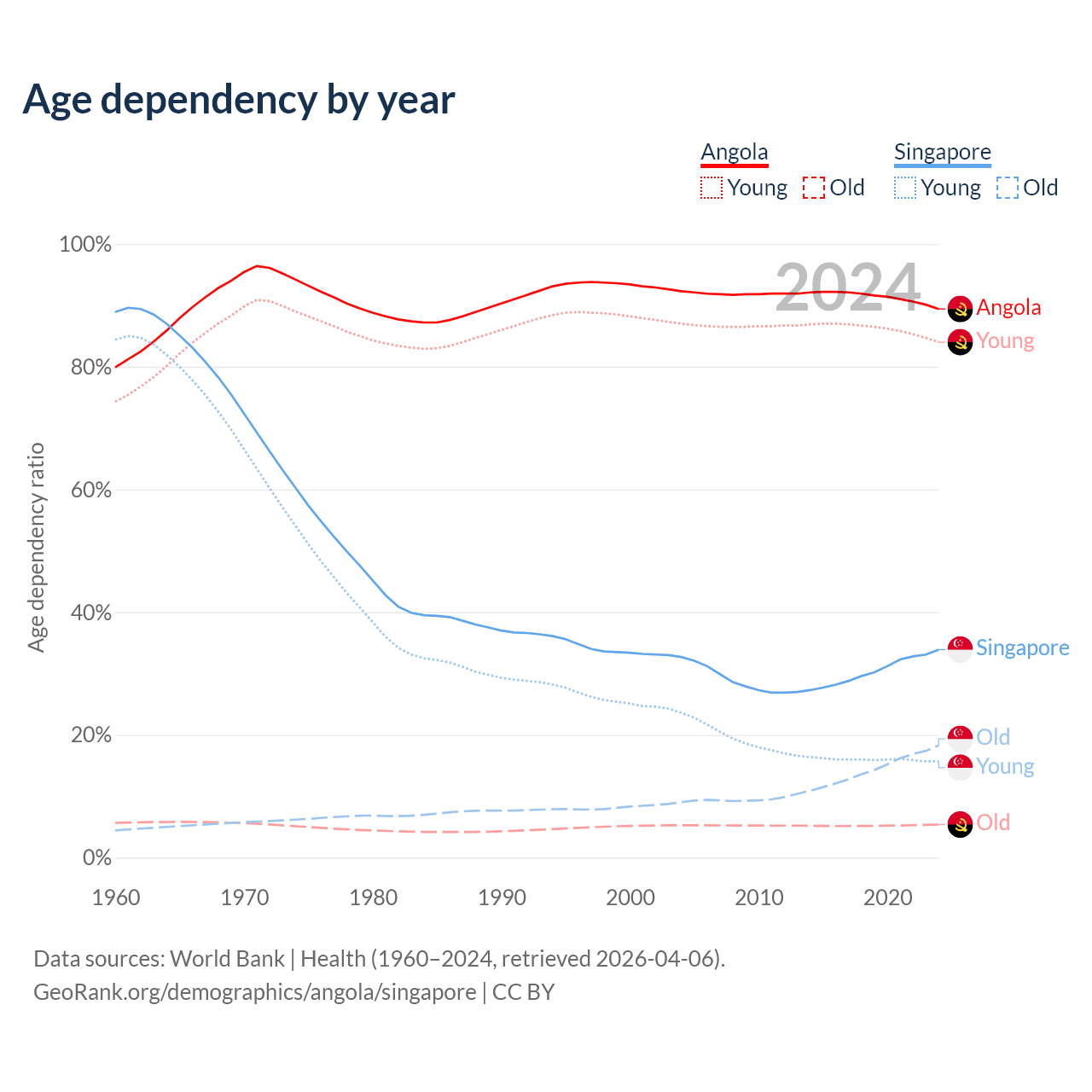- Angola is ranked 188/196 by median age (oldest to youngest) vs 68/196 for Singapore.