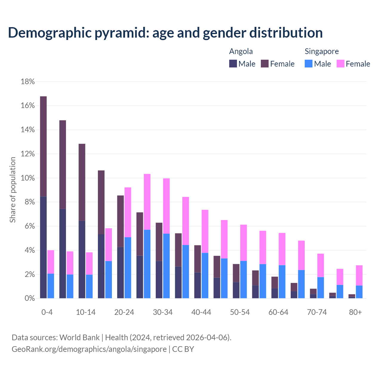 - As of 2026, the population of Angola is 40.6M vs 6.13M in Singapore - 6.62 times difference.