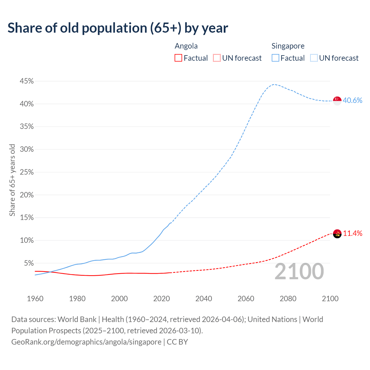 The share of older people aged 65 and over is 2.85% in Angola and 13.7% in Singapore. Life expectancy in Angola compared to Singapore .