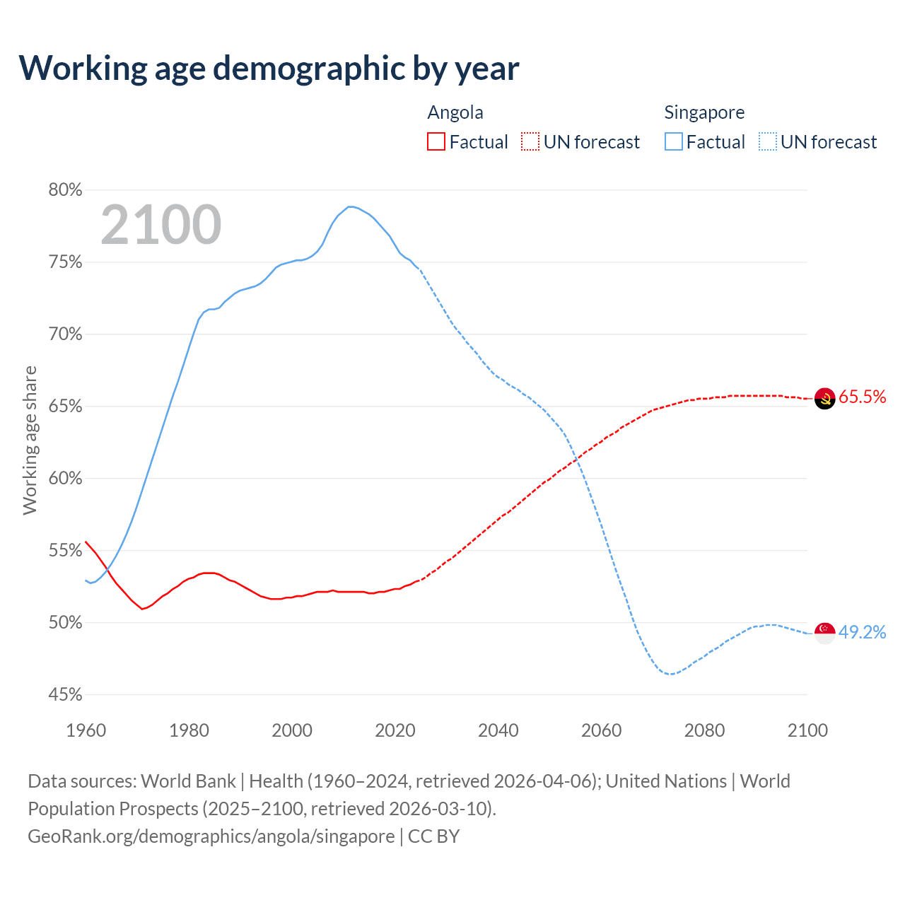 - Angola has 21.4M working age adults (aged 15-64) vs 4.57M in Singapore.
