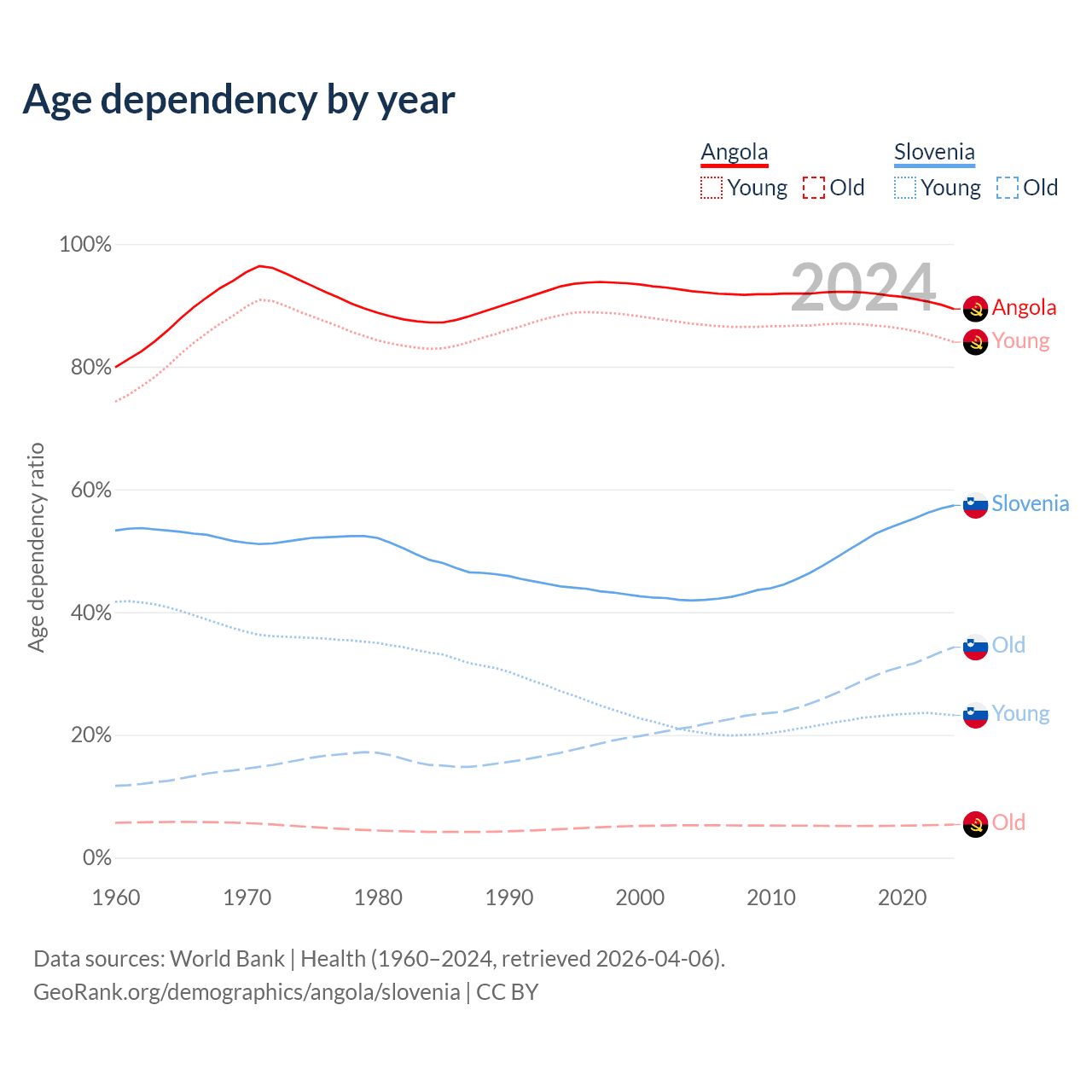 - Angola is ranked 188/196 by median age (oldest to youngest) vs 14/196 for Slovenia.