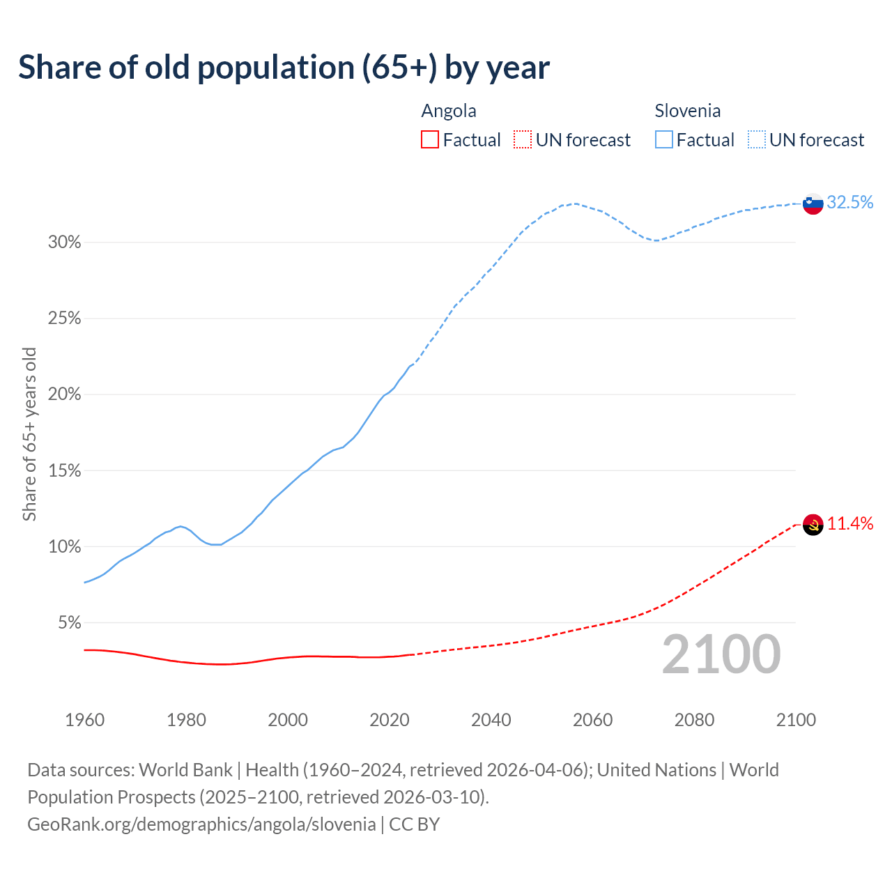 - The share of old-age demographic (65+) in Angola is 2.85% vs 21.8% in Slovenia.