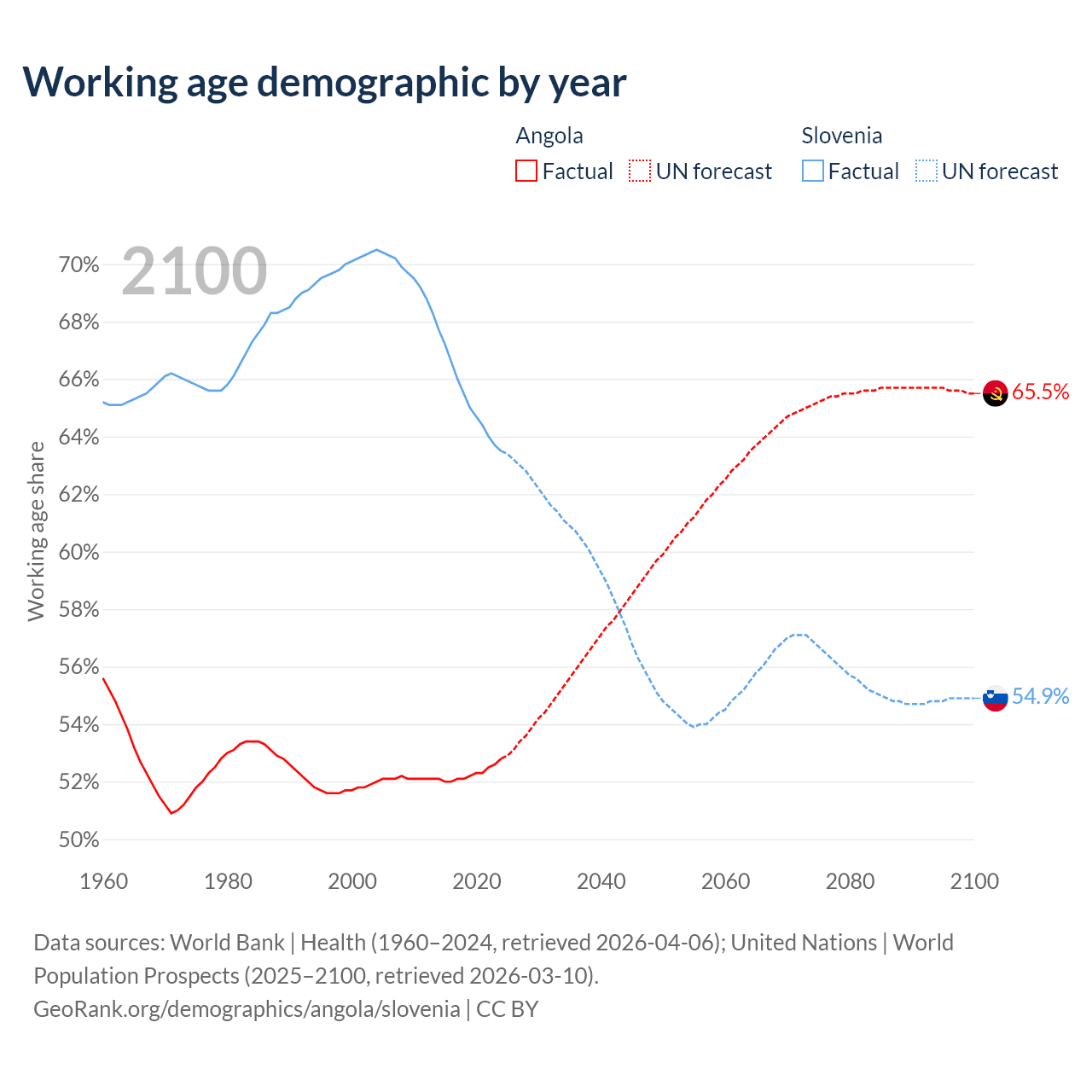 - Angola has 21.4M working age adults (aged 15-64) vs 1.35M in Slovenia.