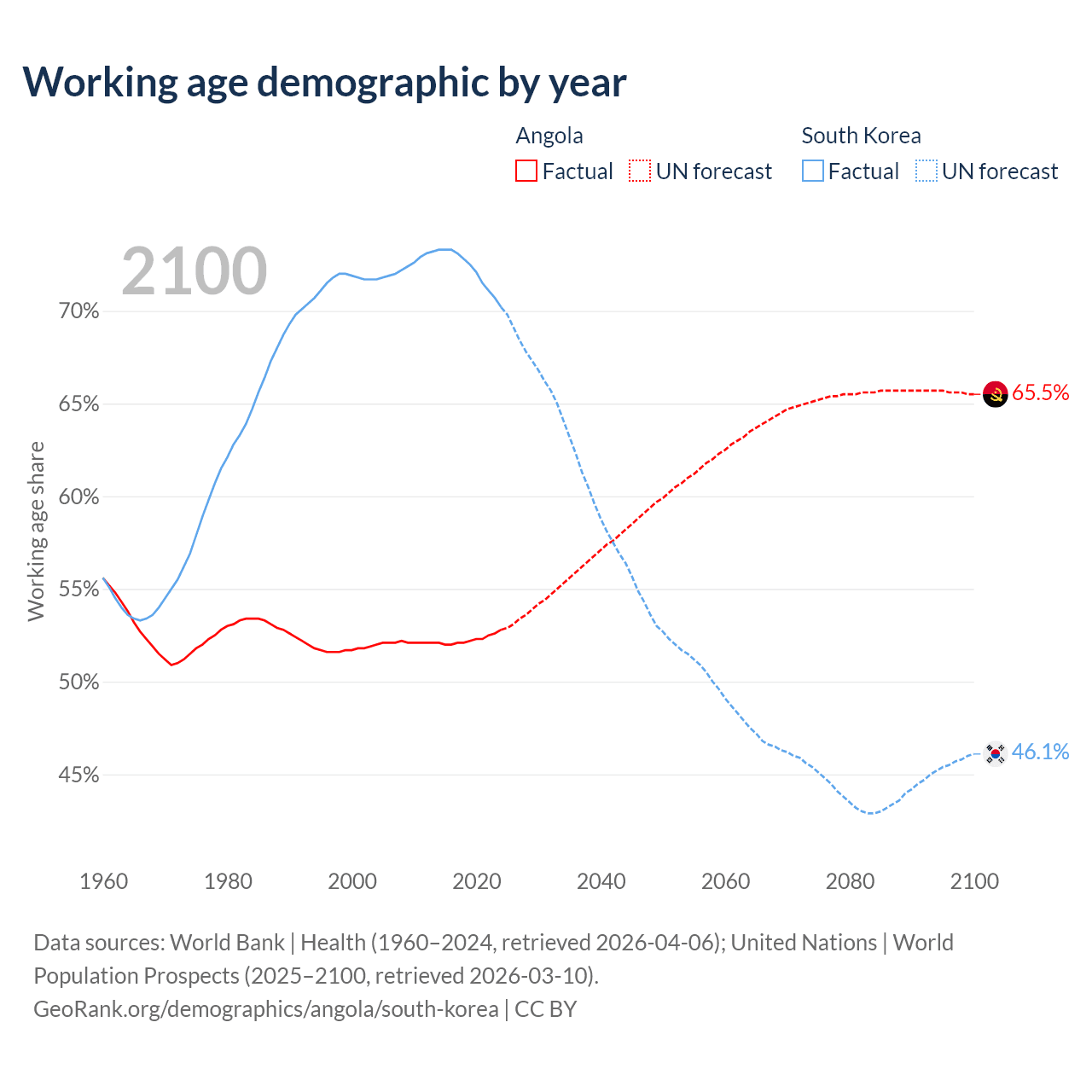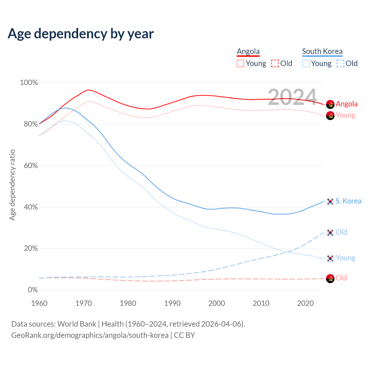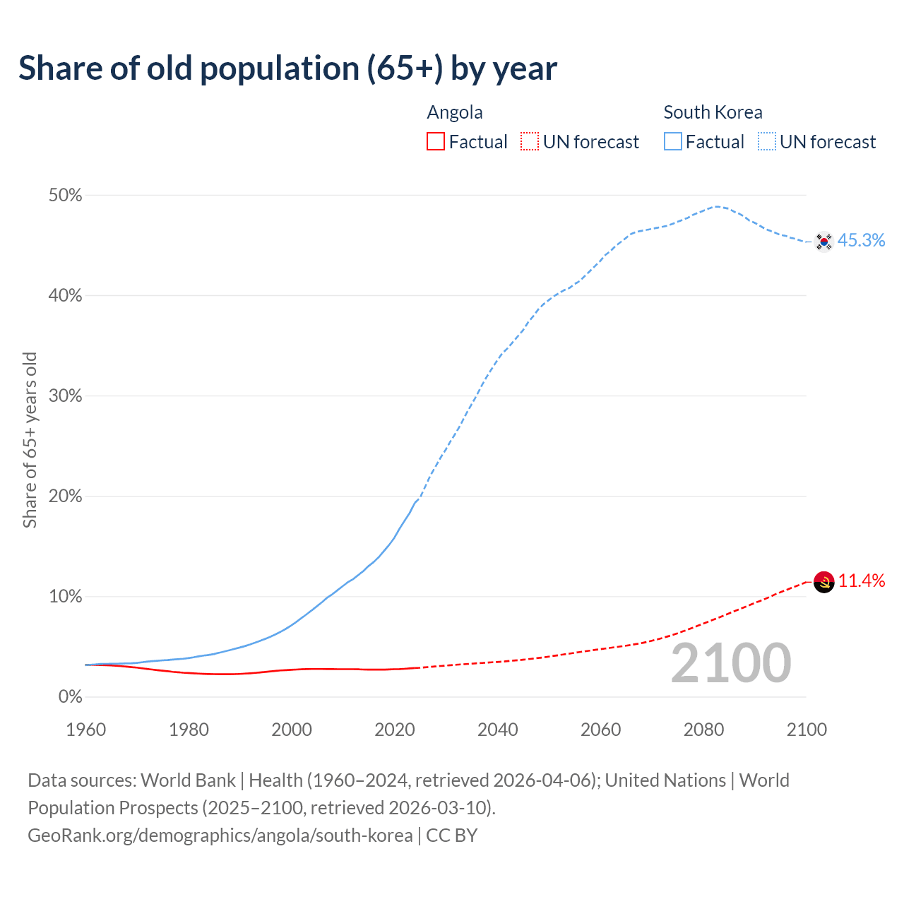 The share of older people aged 65 and over is 2.85% in Angola and 19.3% in South Korea. Life expectancy in Angola compared to South Korea .