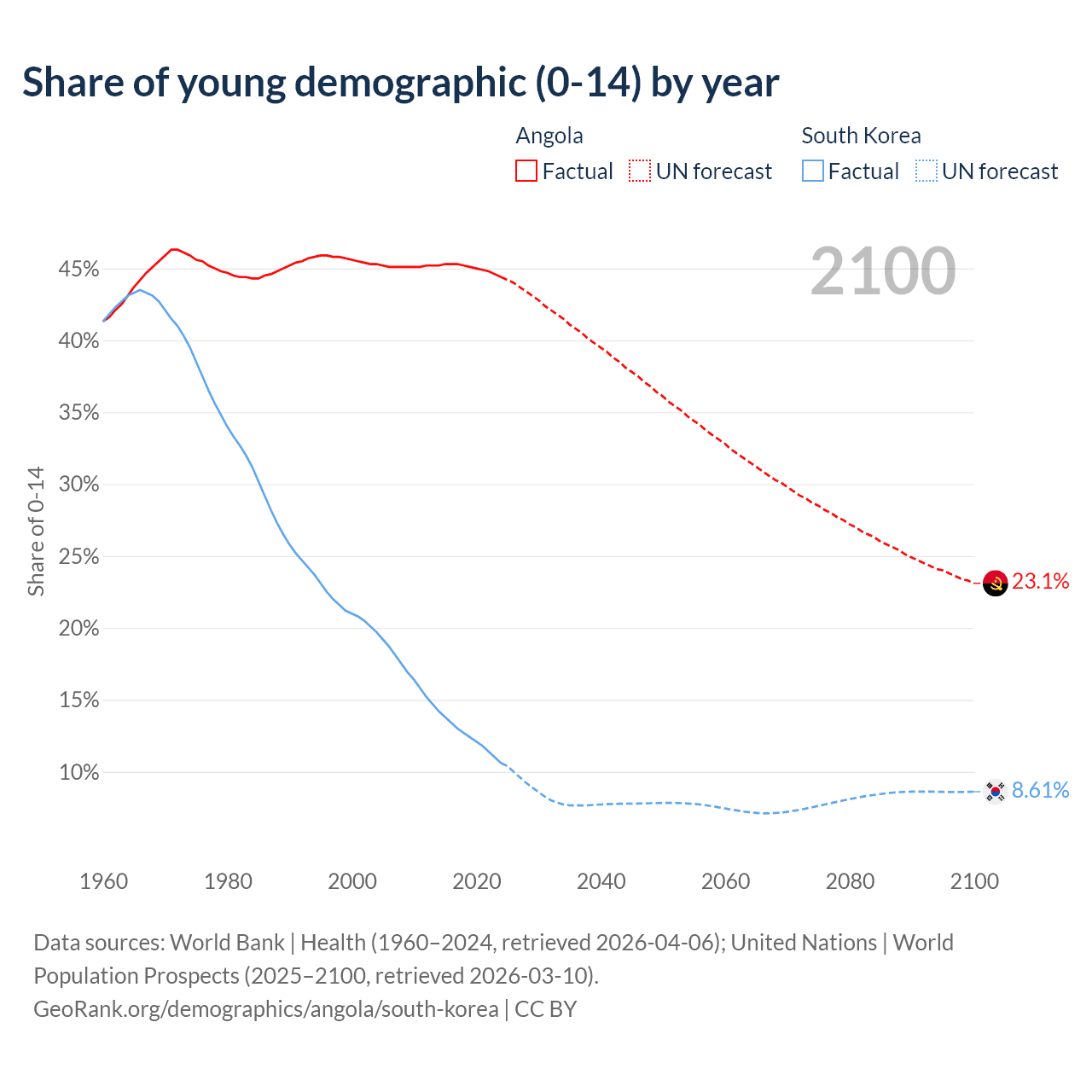 - The share of young demographic (0-15 years old) in Angola is 44.4% vs 10.6% in South Korea.