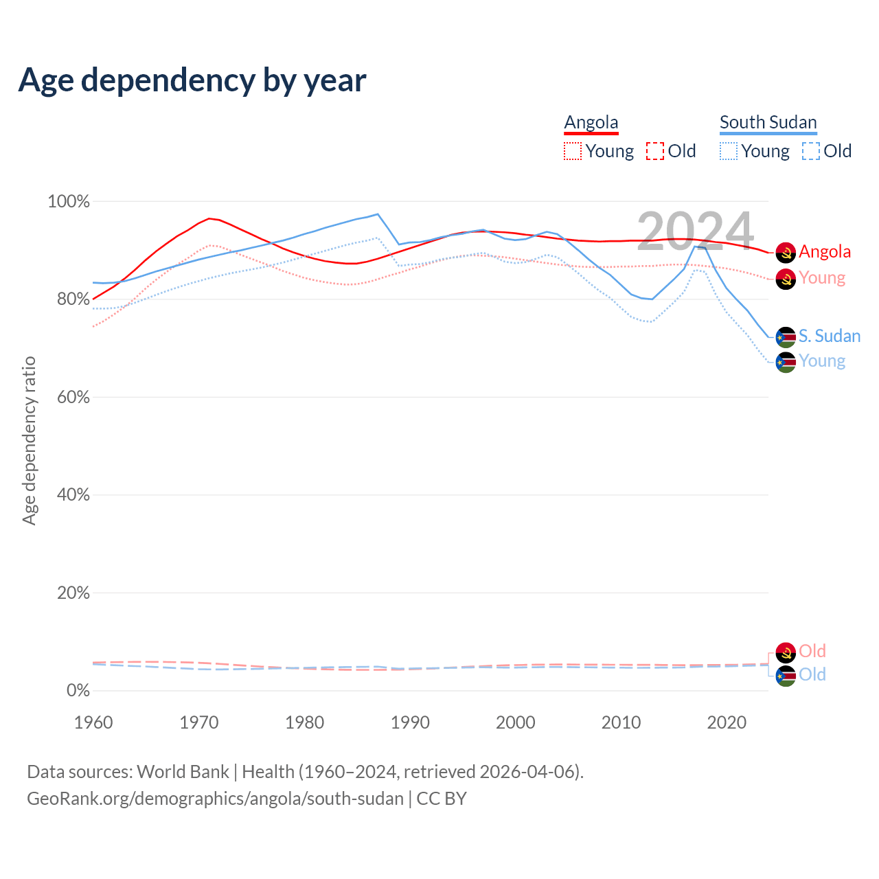 - The share of old-age demographic (65+) in Angola is 2.85% vs 2.99% in South Sudan.