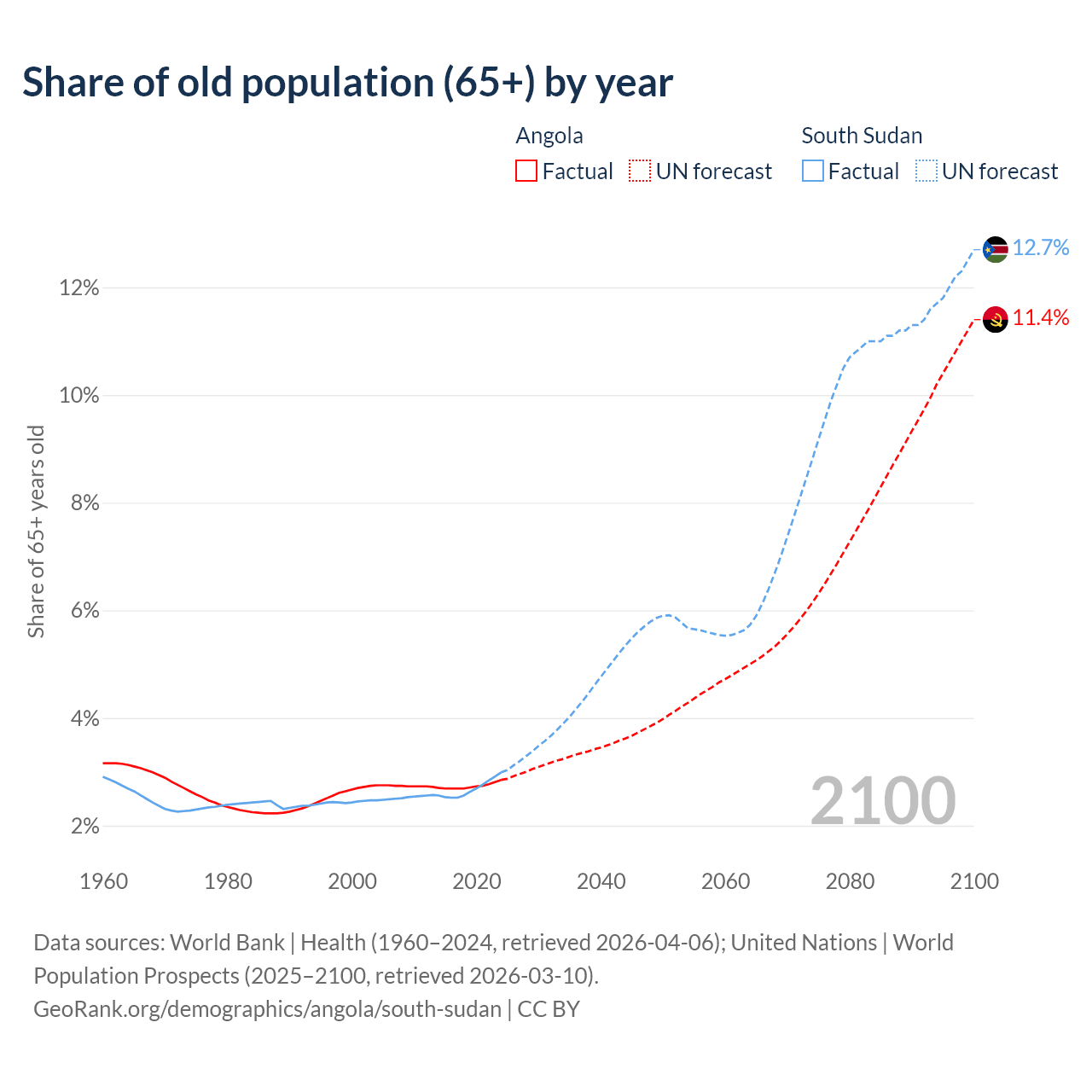 The share of older people aged 65 and over is 2.85% in Angola and 2.99% in South Sudan. Life expectancy in Angola compared to South Sudan .
