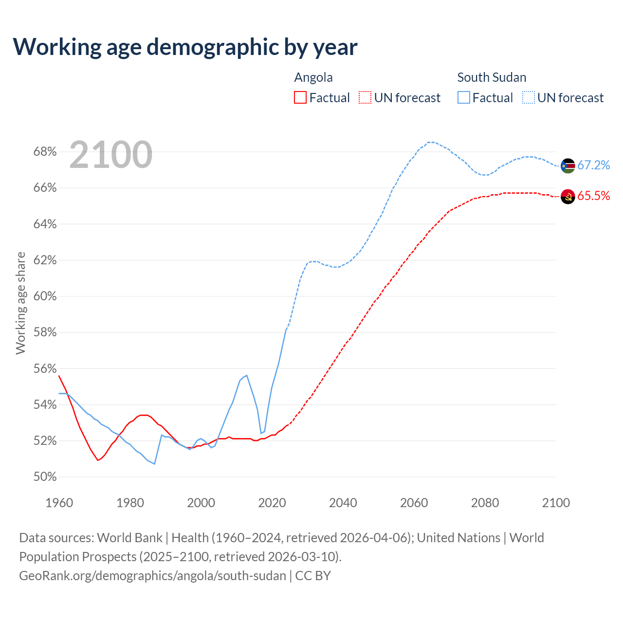 - Angola has 21.4M working age adults (aged 15-64) vs 7.27M in South Sudan.